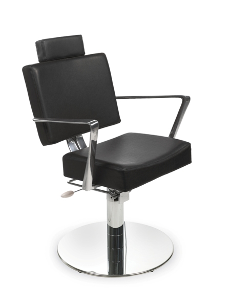 Кресло для клиента комплектуется дисковым основанием из нержавеющей стали и гидроподъемником с блокировкой. Кресло оснащено регулируемой спинкой и подголовником, а также металлическими подлокотниками. Обивка - искусственная кожа высшего качества.