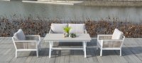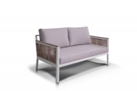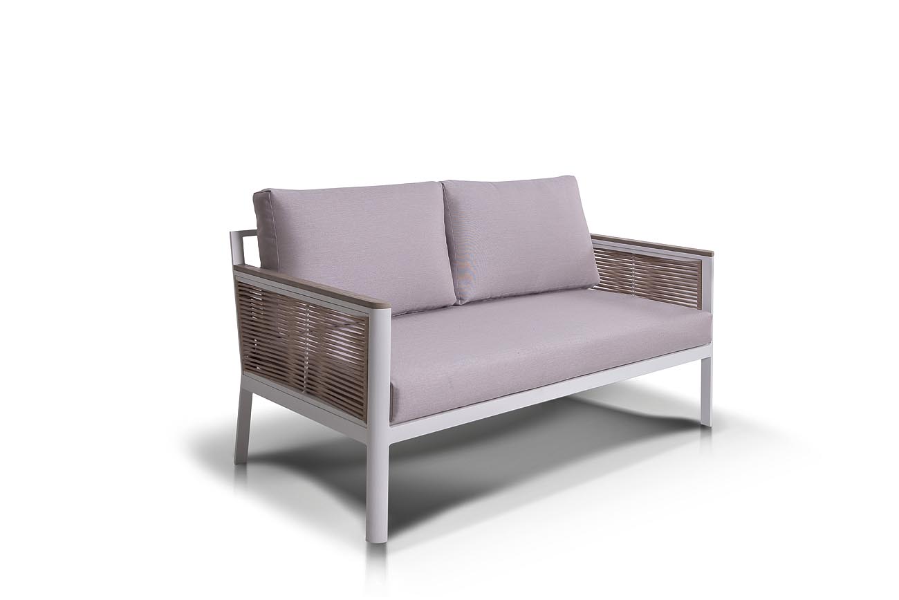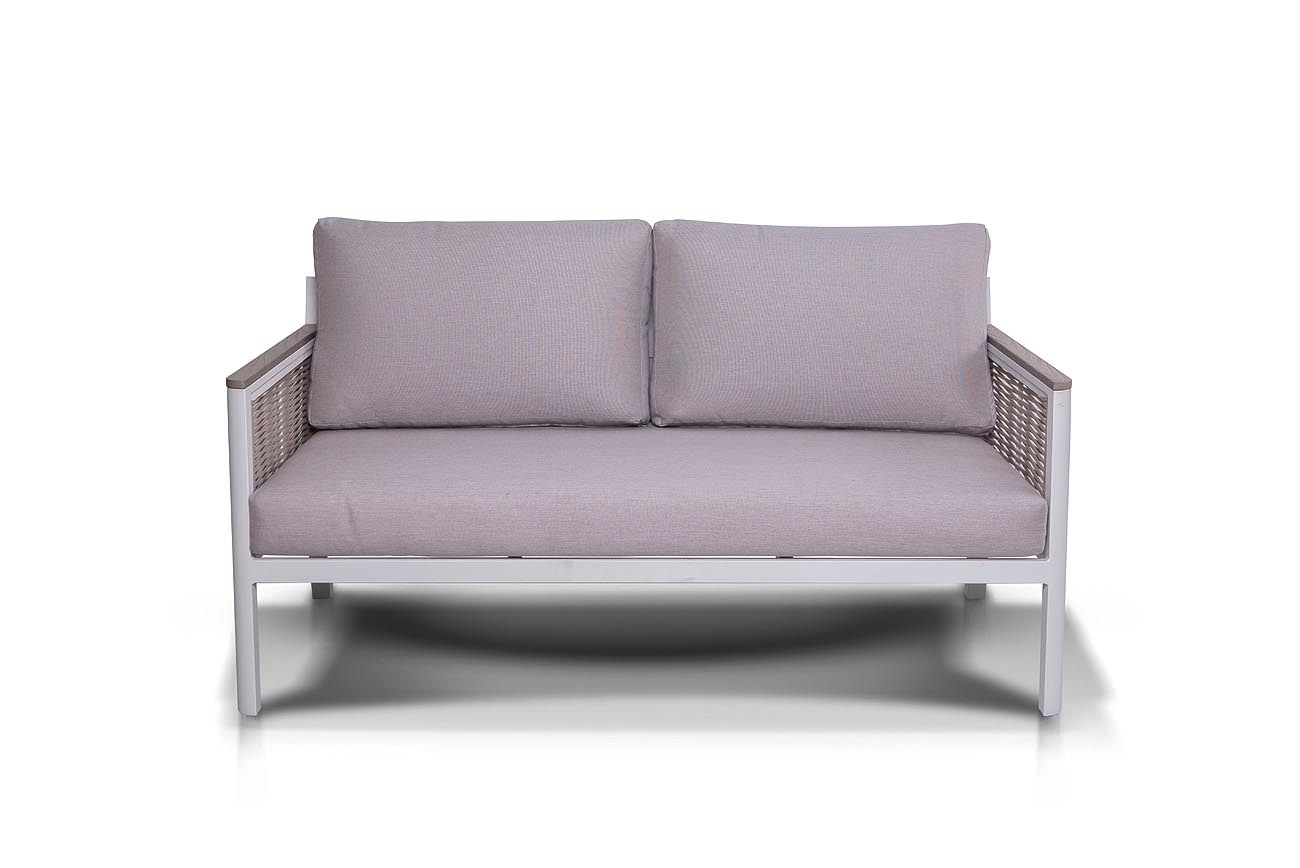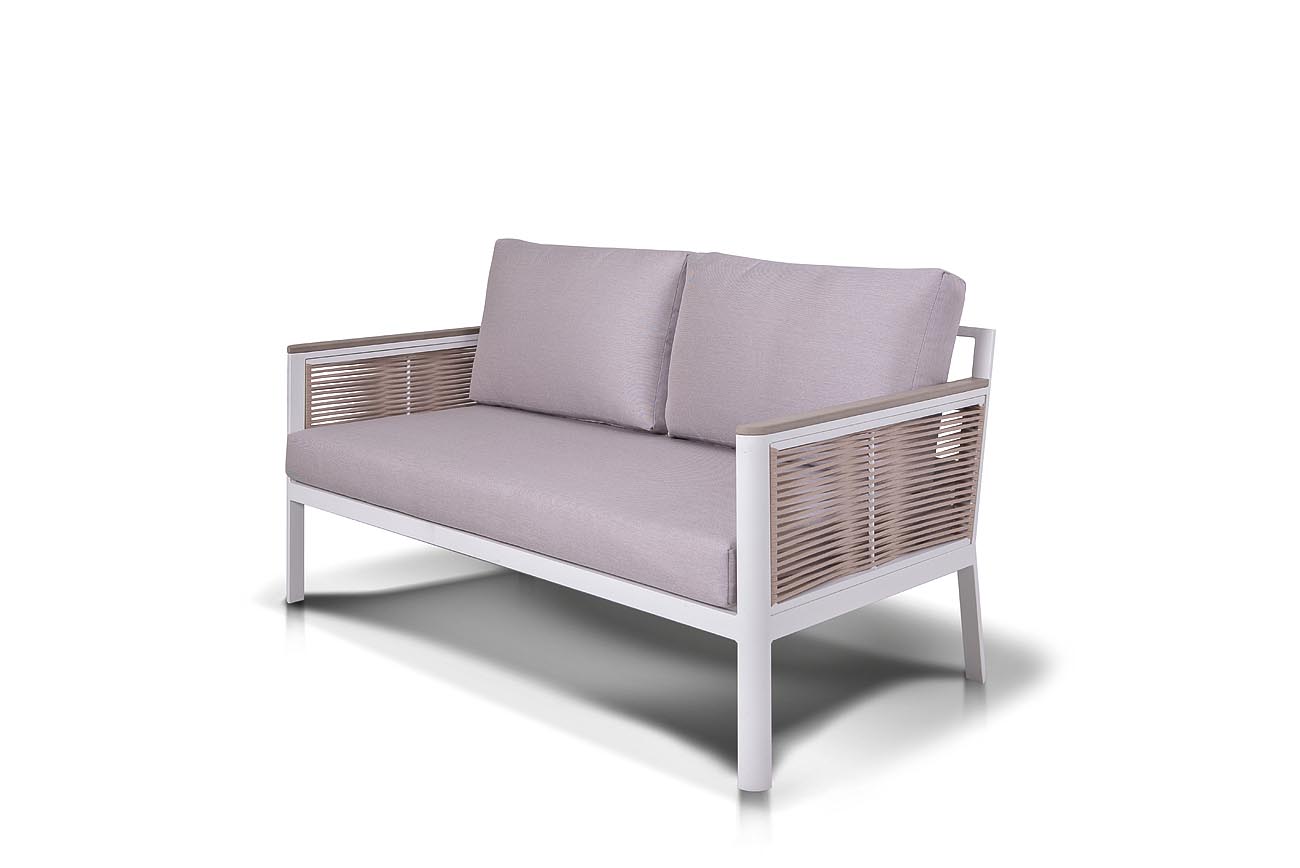 Сан ремо диван двухместный. Сан Ремо диван двухместный, алюминиевый каркас белого цвета, искусственный ротанг, цвет бежевый. В комплеке с подушками серого цвета со съемными чехлами. Размер 780х1460х700 Габариты 1460x780x700мм Материал подушки полиэстер 100% плотностью 230гр/м2 с влагоотталкивающей пропиткой Вес 17кг