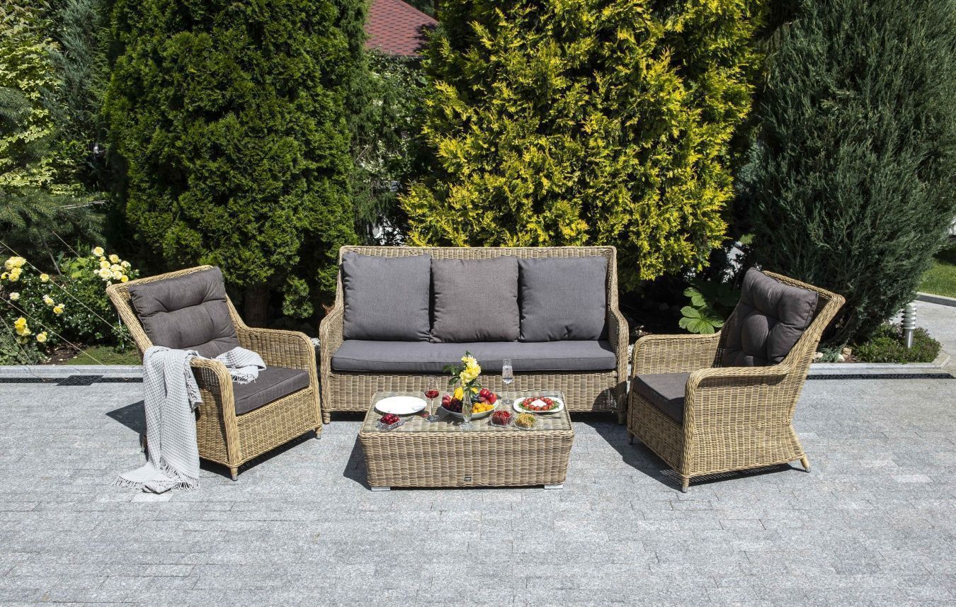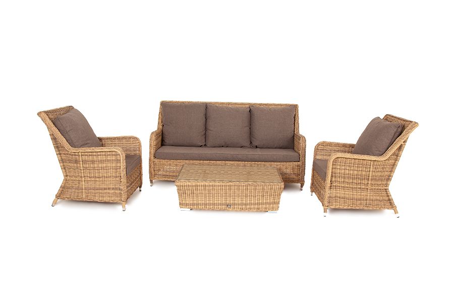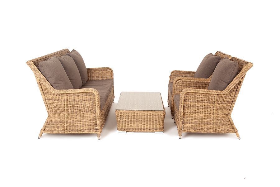 Гляссе лаунж-зона из искусственного ротанга, цвет соломенный. Вместительная лаунж-зона «Гляссе» состоит из: - трехместного дивана – 1900x900x980 мм - двух кресел – 900x730x980 мм - журнального столика – 1100x660x300 мм. Модели имеют алюминиевый каркас, который оплетен вручную искусственным ротангом натурального соломенного цвета. Плетеная мебель дополнена удобными подушками в серых чехлах. При их изготовлении используют полиэстер, плотность – 230гр/м2. Он обрабатывается влагоотталкивающей пропиткой для повышения защитных свойств материала. Журнальный столик оснащен пластиковыми ножками и столешницей из закаленного стекла толщиной 5 мм. Вид ротанга круглый Цвет плетения соломенный Цвет подушки серый Материал каркаса (стул/кресло/диван) алюминий Материал плетения искусственный ротанг Материал подушки полиэстер 100% плотностью 230гр/м2 с влагоотталкивающей пропиткой Габариты упаковки (ДШВ) 190/99/145 Вес (Брутто) 76 Вес (Нетто) 77кг