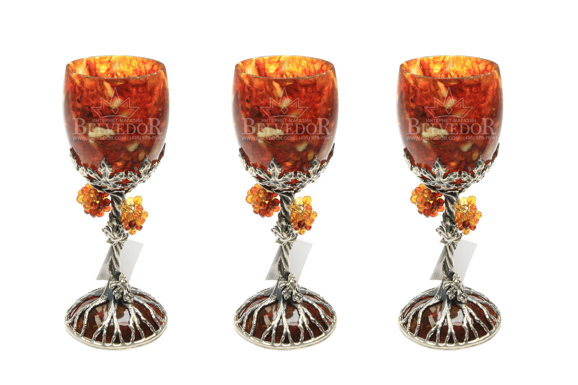 Бокалы из янтаря для вина "виноград" в наборе на 3 персоны (серебро).