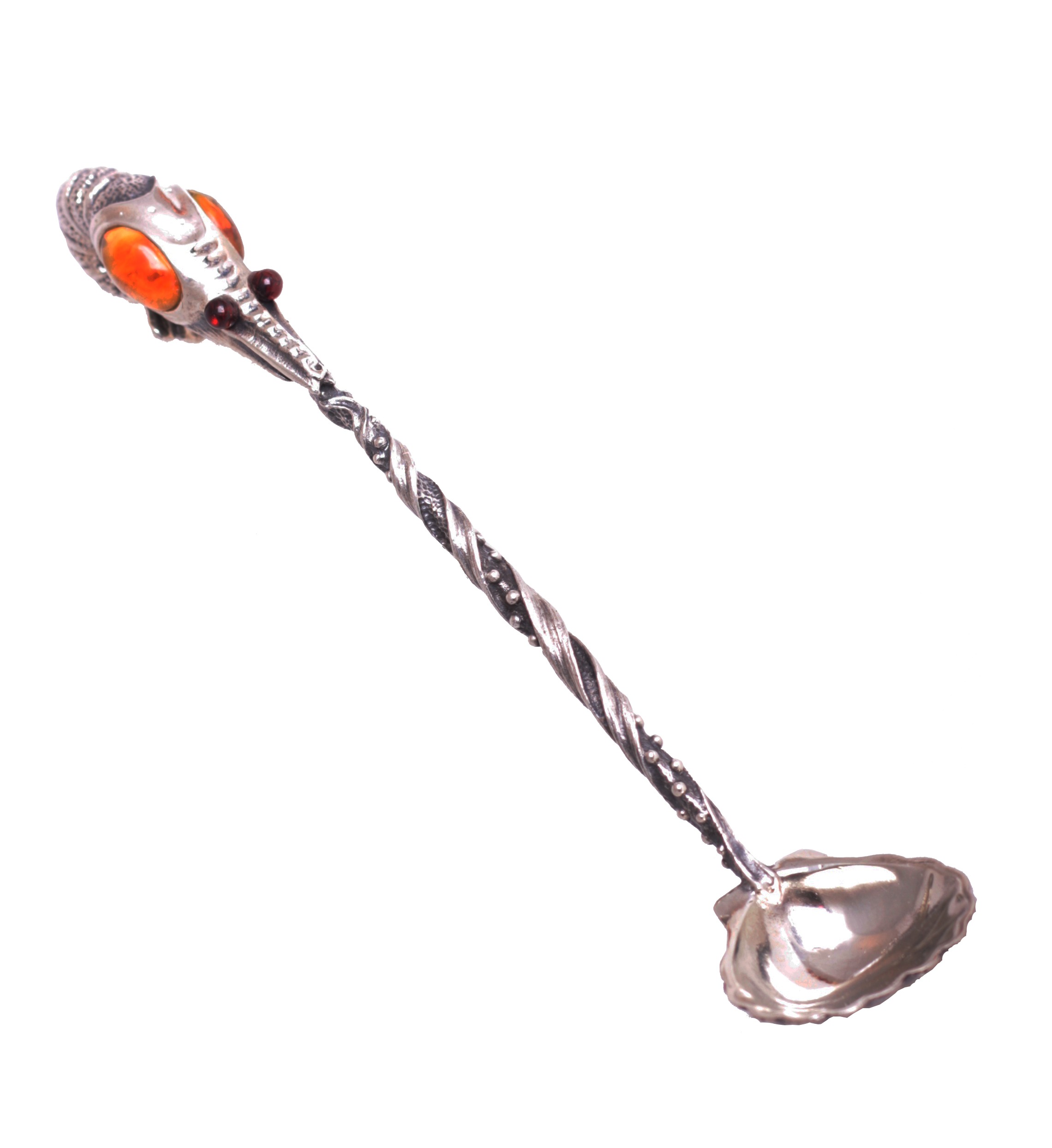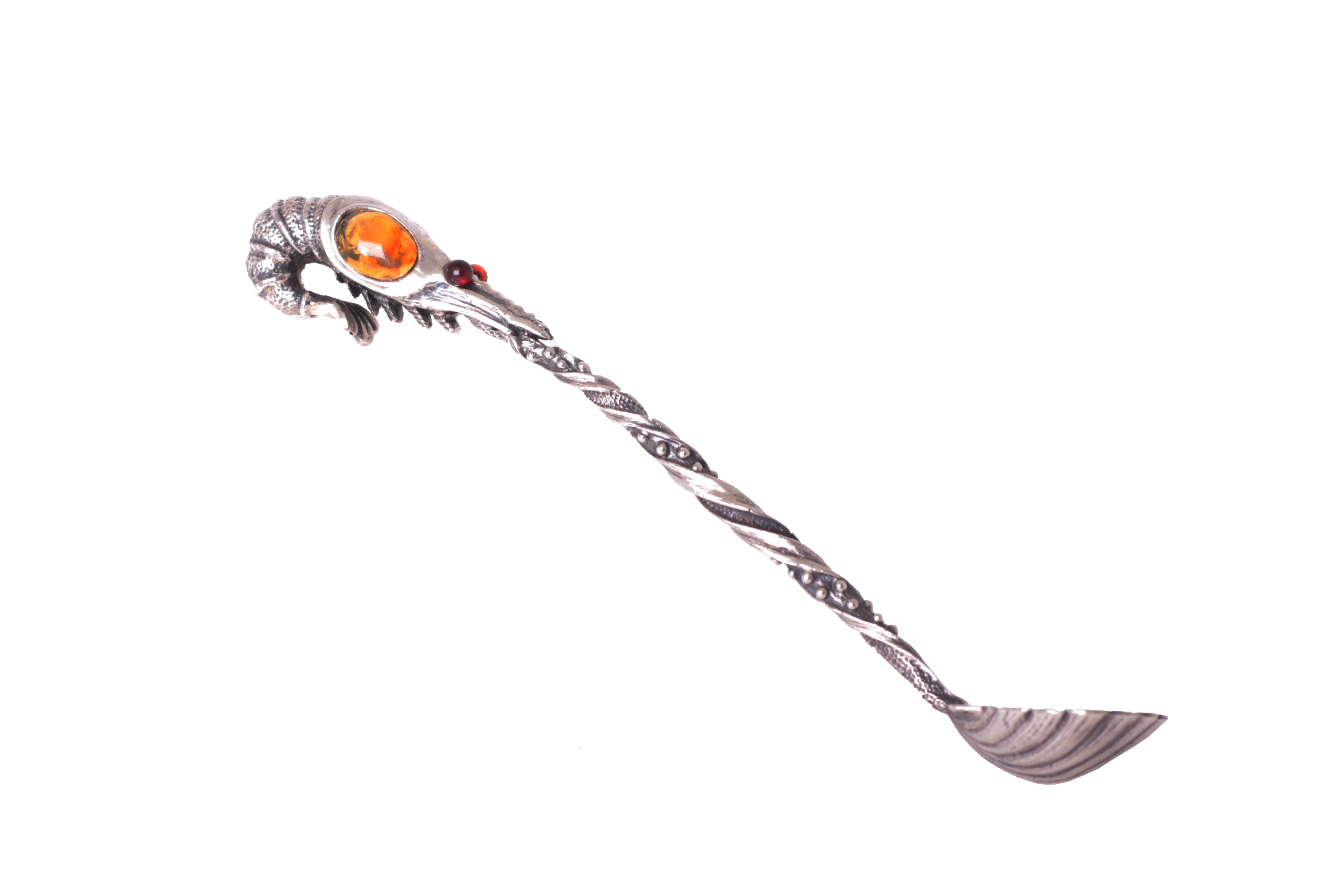 Ложка серебряная "креветка" с янтарем. Состав: янтарь, серебро 875 пробы. Длина 13,5 см. Вес серебра в изделии 49,00 гр. Поставляется в подарочном футляре. В случае отсутствия товара на складе срок изготовления и поставки от 3-х недель.