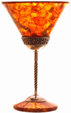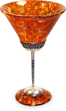 Фужер из янтаря для мартини "антик". Высота: 7,0 см, диаметр емкости: 9,0 см Состав: натуральный янтарь, белая ювелирная бронза или серебро 875 пробы. Вес серебра в изделии - 42,5 гр. Поставляется в подарочном футляре. В случае отсутствия товара на складе срок изготовления от трех недель.