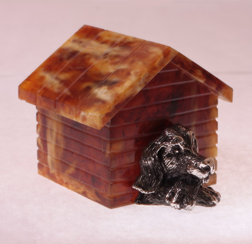 Сувенир "пес в будке". Состав: янтарь, серебро 875 пробы. Размеры: 6*6*6 см. В случае отсутствия товара на складе, срок изготовления составляет от 3 недель.