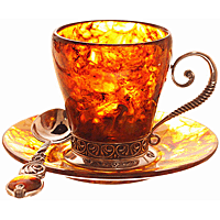 Набор для кофе из янтаря. Состав: натуральный янтарь,белая ювелирная бронза или серебро 875 пробы. Чашечка - высота: 5,0 см, диаметр: 6,0 см; блюдце - диаметр 11,0 см. В набор входит чашка, блюдце, ложечка. Набор в элегантном футляре. Может поставляться наборами на 1, на 2, на 3 и на 6 персон. Рекомендуемая температура для горячего кофе не более 80 градусов. В случае отсутствия товара на складе срок изготовления от трех недель.