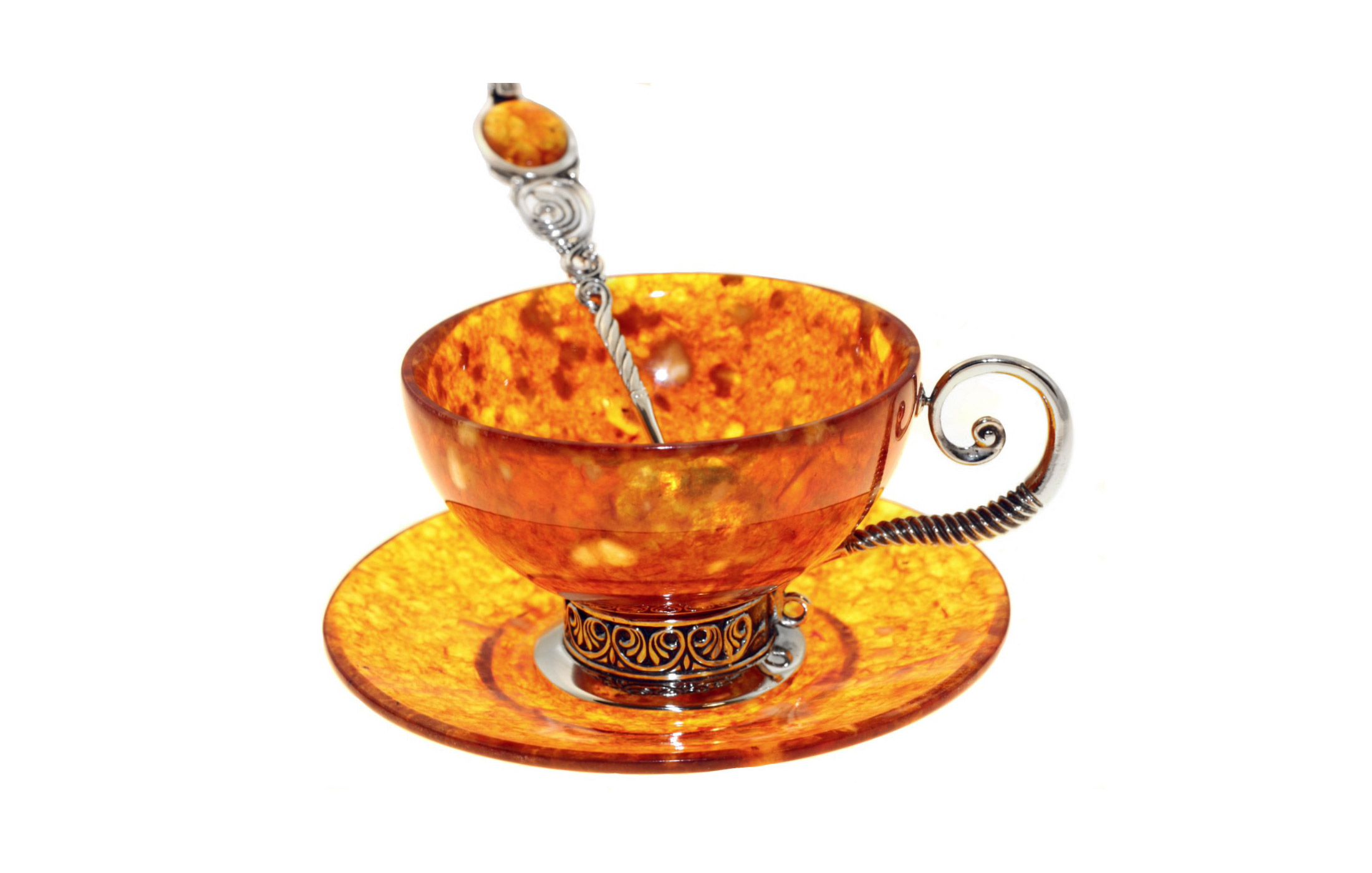 Чайный набор из янтаря "антик" (серебро). Высота чашки 5,5 см; диаметр емкости: 8 см; диаметр блюдца: 11 см; длина ложечки: 12 см. Объем 90 мл. Состав: натуральный янтарь,белая ювелирная бронза или серебро 875 пробы. В набор входит чашка, блюдце, ложечка. Набор в элегантном футляре. Может поставляться наборами на 1, на 2, на 3 и на 6 персон. Рекомендуемая температура для горячих напитков (чай, кофе) не более 80 градусов. В случае отсутствия товара на складе, доставка - от 3 недель.
