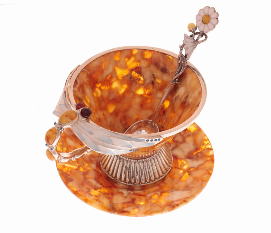 Чашка Саламандра из янтаря и серебра Набор тарелок 2 шт десертных закусочных 19 см на 2 персоны Anna Lafarg Emily Flowers, костяной фарфор, мелкие