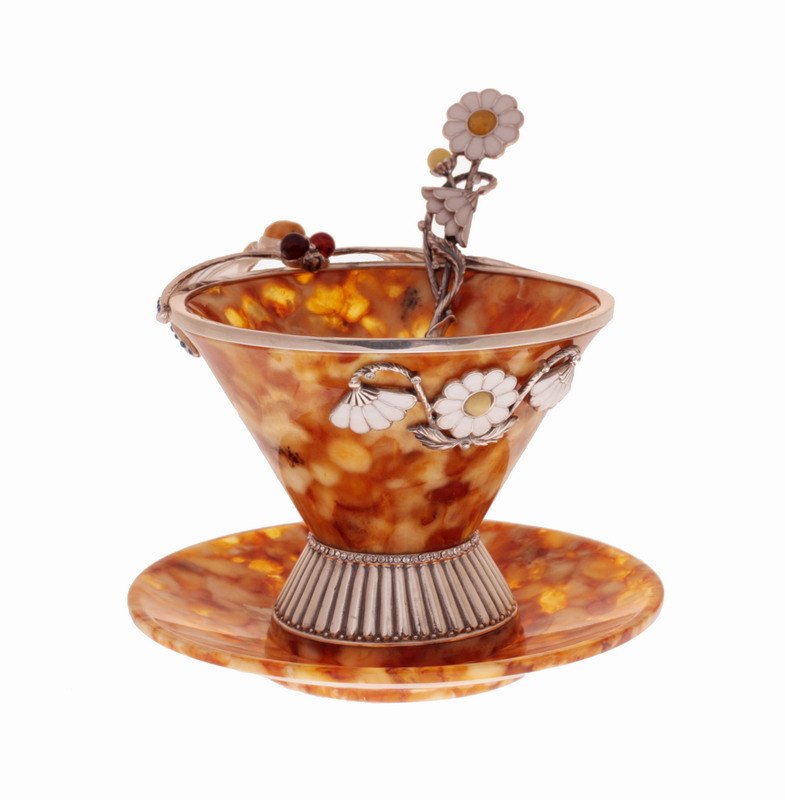 Чайный набор "стрекоза" из янтаря на 1 персону (ювелирная бронза)