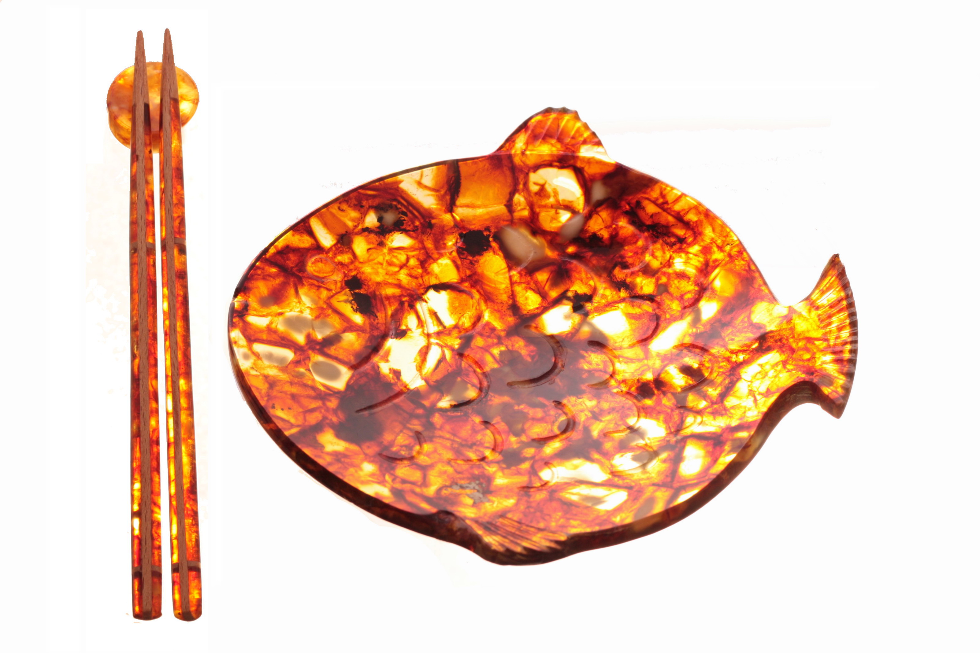 Янтарная тарелка "рыбка" с палочками для еды из янтаря