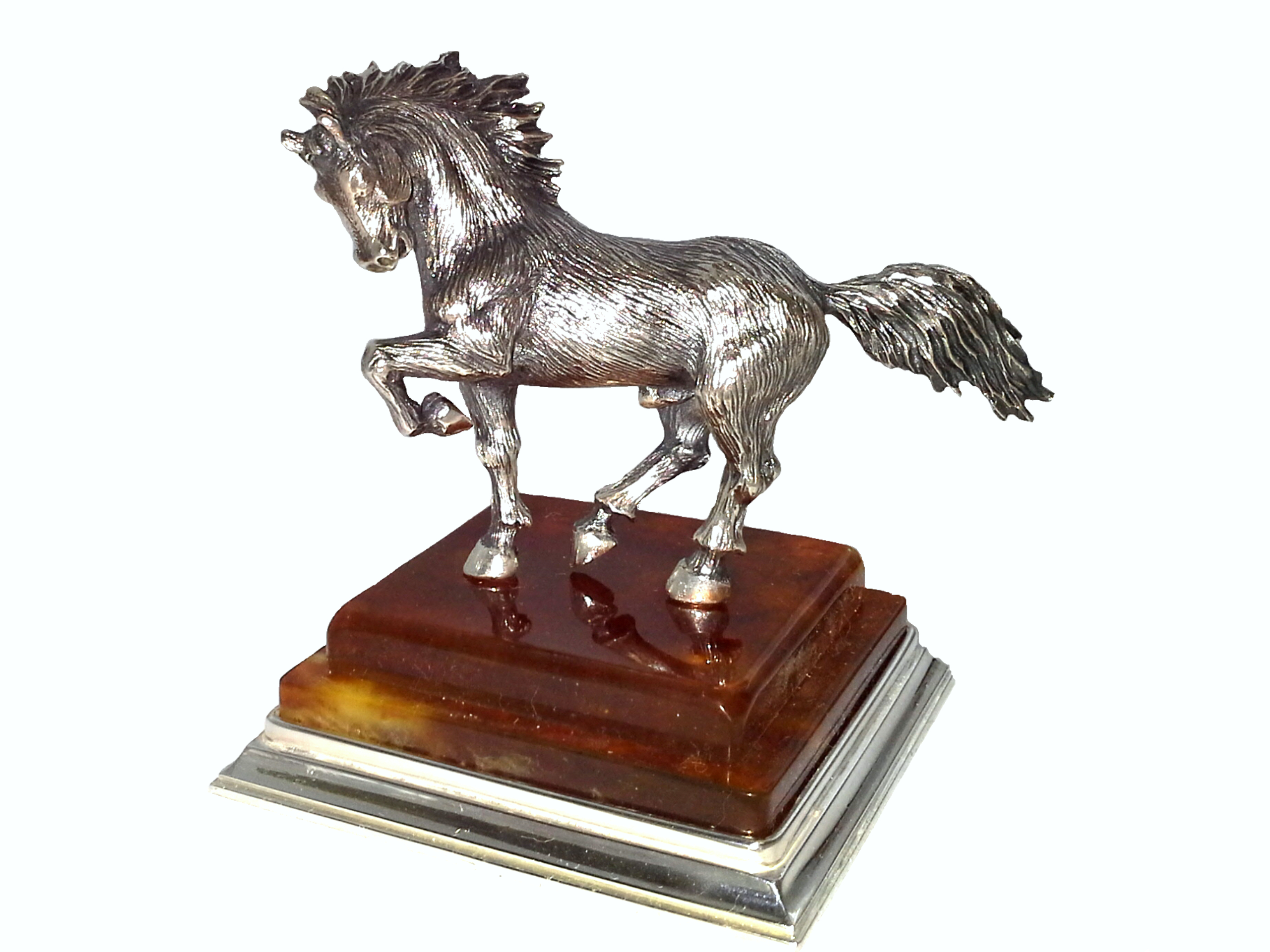 Сувенир "лошадь" из янтаря. Состав: янтарь, белая ювелирная бронза или серебро 875 пробы. Вес серебра в изделии - 74,5 гр. Высота - 6 см, основание: 4,7 х 4,7 см. Поставляется в подарочном футляре. В случае отсутствия товара на складе, срок изготовления - от 3 недель.