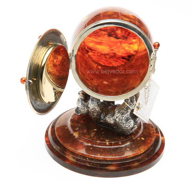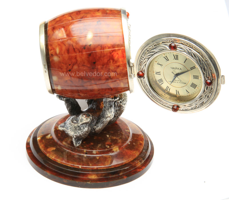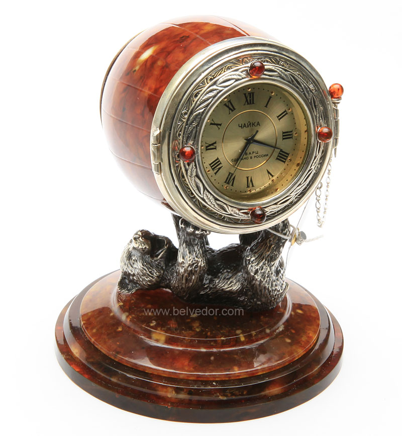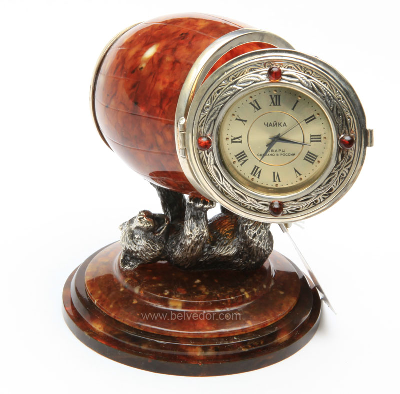 Сувенир-часы "цирковой медведь" из янтаря. Состав: натуральный янтарь, серебро 875 пробы / белая ювелирная бронза, часы кварцевые. Вес серебра в изделии - 250 гр. Поставляется в подарочном футляре. В случае отсутствия товара на складе срок изготовления от трех недель.