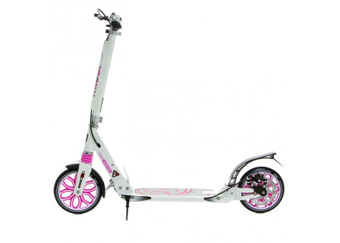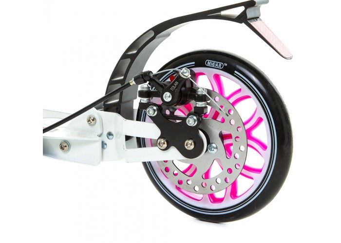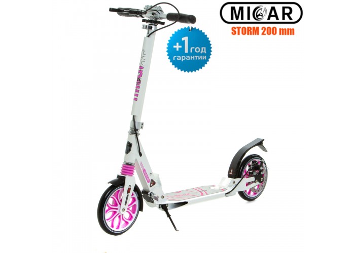 Двухколёсный самокат micar storm 200 бело-розовый (арт. ht2008d). Амортизатор передний и задний Вес самоката 5.9* кг Возрастная категория От 6-7 лет Гарантия производителя 1 год Дополнительные функции подставка, специальный зажим для ручек на руле Максимальная нагрузка 100 кг Материал рамы 100% Алюминий Подшипники ABEC-11 608zz Размер колёс 200 мм Размер платформы 34 х 14 см Регулируемая высота руля 82-105 см Тормоз Ручной дисковый тормоз заднего колеса, ножной тормоз над задним колесом  развернуть описание ▼