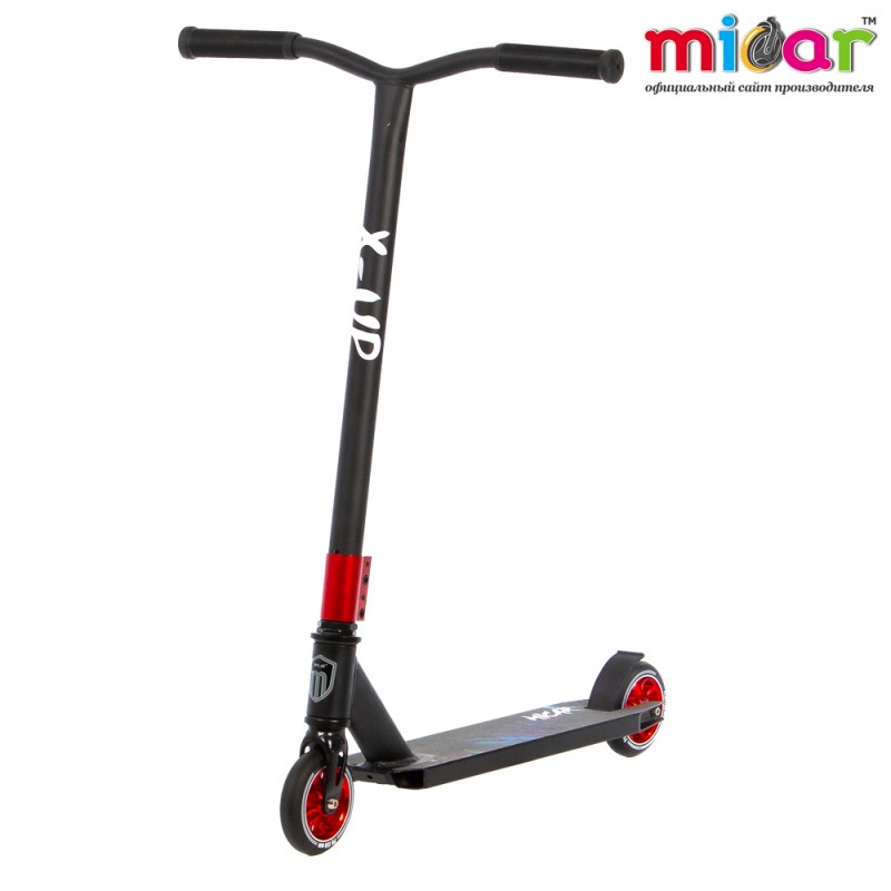 Трюковой самокат micar x-up чёрный. Вес самоката 3.2 кг Высота руля 600 мм Грипсы Мягкие резиновые Дека Алюминий Зажим 4-х болтовой, алюминиевый Подшипники ABEC 9 Размер деки 105 х 500 мм Размер колес 110 х 24 мм Руль Стальной Тормоз Стальной Ширина руля 480 мм