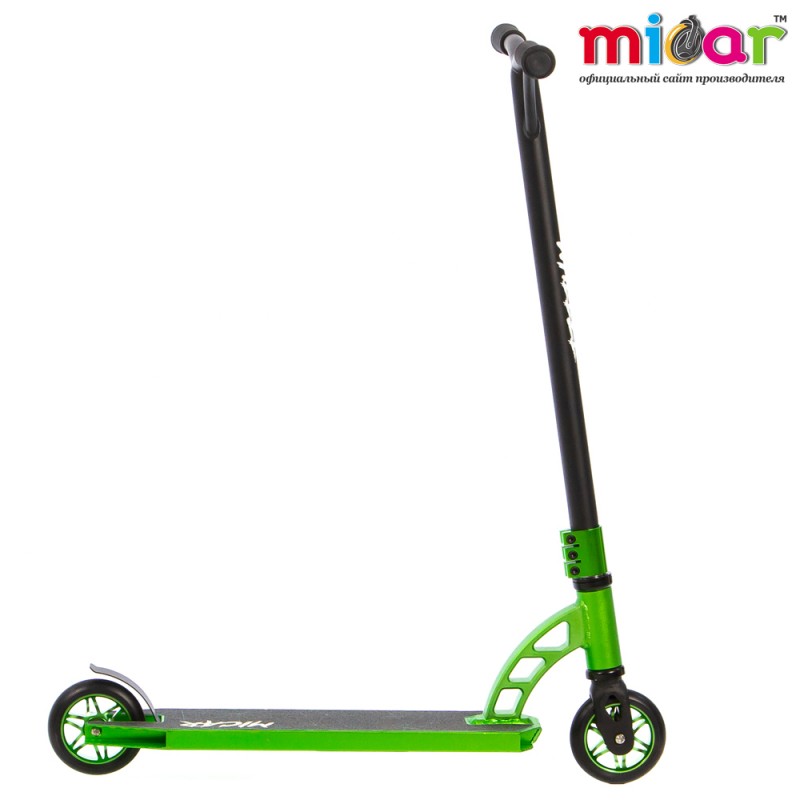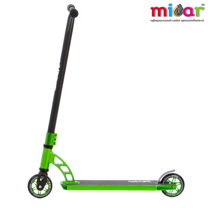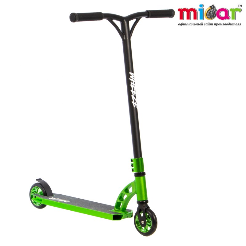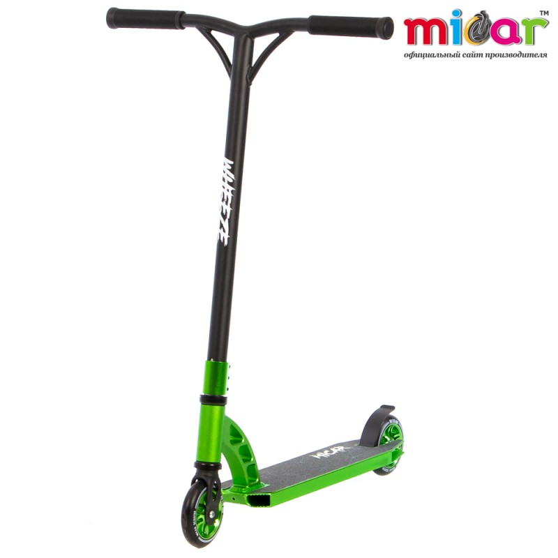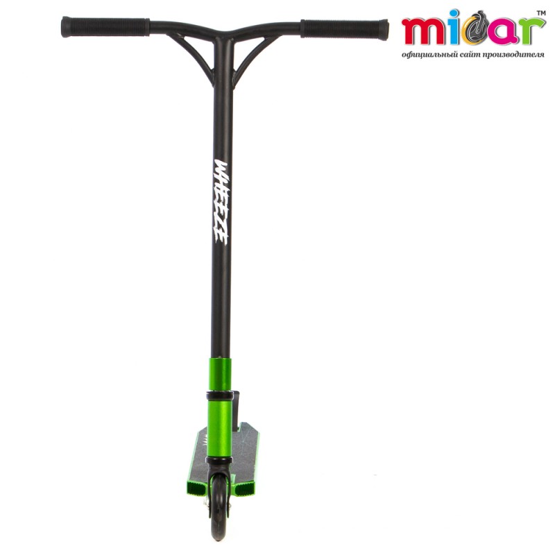 Трюковой самокат micar wheeze зелёный. Вес самоката 3.9 кг Высота руля 600 мм Грипсы Мягкие резиновые Дека Алюминий Зажим 3-х болтовой, алюминиевый Компрессия HIC Подшипники ABEC 9 Размер деки 110 х 510 мм Размер колес 110 х 24 мм Руль Стальной Тормоз Стальной Ширина руля 580 мм