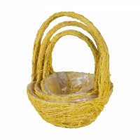 Корзины из ротанга, на основе проволочного каркаса, идеально подходят, для воплощения Ваших креативных идей. Корзины имеют вставку из полиэтилена, которая позволяет не только составлять композиции из цветов, но и выращивать цветы не посредственно в корзине. Наименование: Набор корзин для флористики Артикул: J14038 S/3 Цвет: желтый Размер: Ø25 H10/32, Ø20 H9/28, Ø17 H8/23 Состав: ротанг