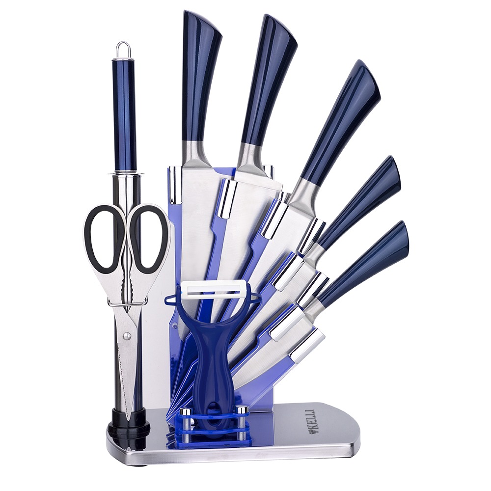 Набор кухонных ножей 9 предметов из нержавеющей стали с подставкой в подарочной упаковке Kelli, в комплекте точилка, ножницы, ов