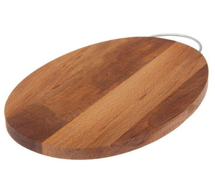 Доска разделочная овал 35х22х1,8 см из бука с металлической ручкой km-11-1. Описание: Разделочная доска — одно из самых необходимых приспособлений на кухне. Ведь нам всегда приходится что-то резать, рубить, измельчать, шинковать и выполнять другие необходимые действия во время готовки. Согласитесь, хорошая кухонная доска во многом облегчает приготовление блюд. Но выбрать такую порой бывает нелегко. Всё дело в разнообразии материалов, из которых делают эту утварь. Если вам приходилось выбирать разделочную доску, вы наверняка задумывались, какая из них более практична, гигиенична и безопасна. Разделочная доска из бука. Данное изделие считается экологичным и прочным, и кроме того разделочная доска из дерева идеально впишется в любой интерьер кухни. Прочный материал позволит эксплуатировать доску долгое время, а классический дизайн придется по вкусу многим хозяйкам. Особенности: Деревянные разделочные доски необходимо хранить в открытом пространстве, не в тумбочках, шкафах и т. д. Разделочные доски из дерева нужно мыть после каждого использования и хорошо просушивать, опять же не в шкафчиках. Если дерево впитало неприятный запах, можно протереть его лимоном или уксусом. Это нейтрализует запах. Перед тем, как доску начать использовать, пропитайте ее маслом (льняным, можно и обычным подсолнечным рафинированным). Это нужно делать периодически в процессе использования разделочной доски из дерева. Тем самым доска прослужит вам дольше.