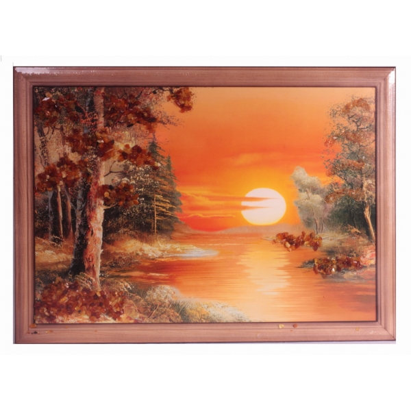 Картина "закат у реки" из янтаря.