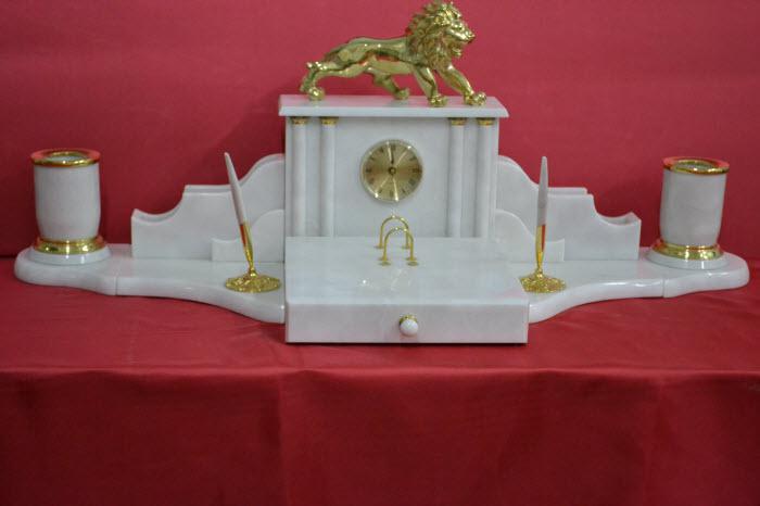 Изумительный настольный набор для руководителя.. Настольный набор из белого мрамора включает в себя: Часы настольные с фигуркой льва, выполненного путем литья -1шт. Подставка под письменные принадлежности - 2шт. Подставка под бумаги - 2шт. Подставка с ручкой - 2шт. Ящик для ценностей - 1шт. Подставка под календарь - 1шт. Визитница -2шт. По вашим пожеланиям можно изменить комплектацию набора.