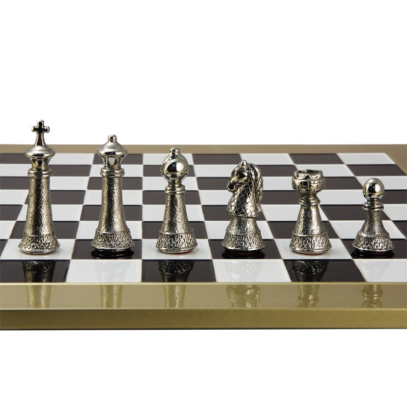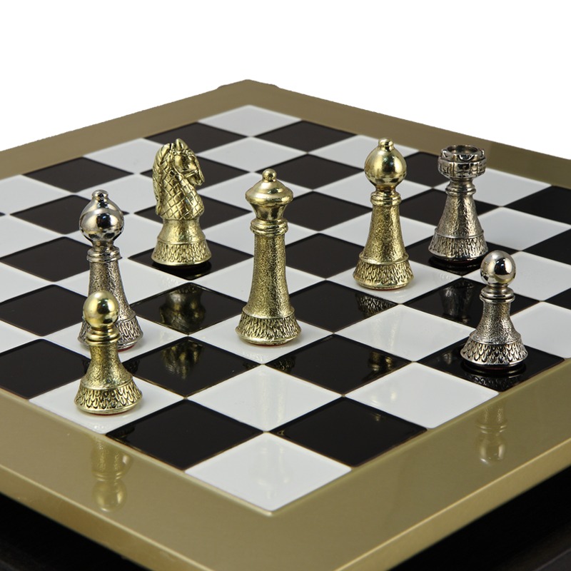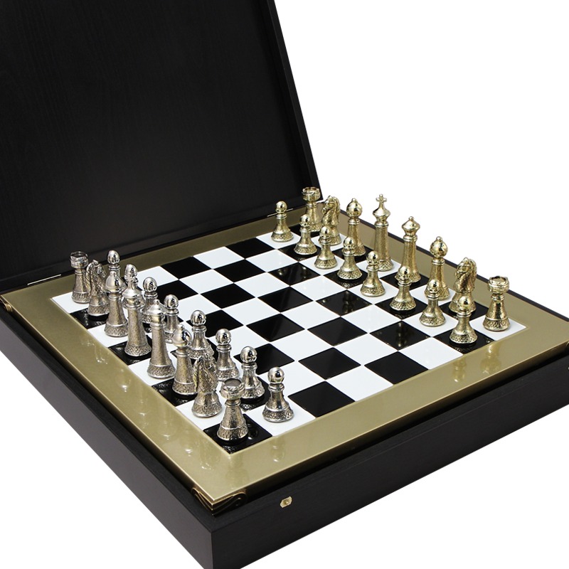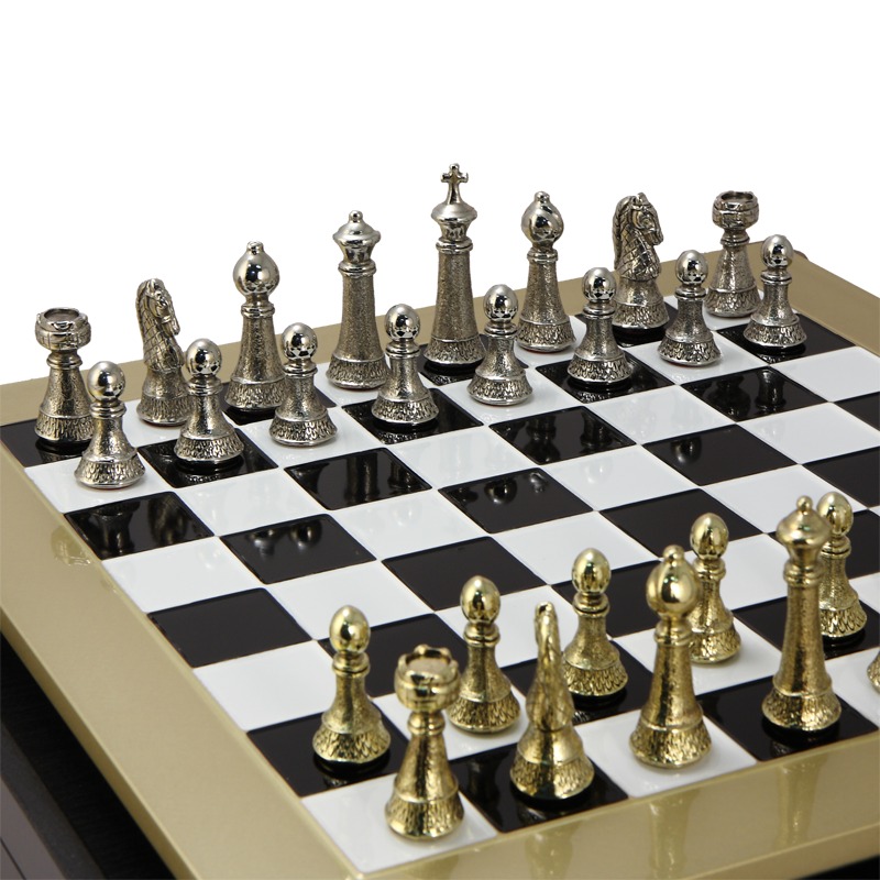 Шахматный набор стаунтон, турнирные. Состав: дерево, замак, латунь, бронза Статус: В продаже Размер: 44x44x3; H=8.4 см Размер с упаковкой: 49 х 49 х 8 см Вес (NETTO): 8 Вес (BRUTTO): 8.25 Описание Набор шахмат «Стаунтон» произведен в Греции на фабрике, специализирующейся на изготовлении шахмат и нард с 1970 года. Их изделия отличаются высокой степенью детализации отделки персонажей, оригинальным оформлением игральных досок и отменным качеством на протяжении всех лет деятельности. Краска на игровое поле наносится вручную, что наделяет каждый набор индивидуальностью и делает его неповторимым. В этом наборе шахматная доска – черно-белая с золотой окантовкой; фигуры цвета золото и серебро. Король 8,8 см. Пешка 5 см. Материалы доски: дсп, тонкий бронзовый лист с рельефными разделителями, специальная краска.. Материалы фигур: замак с латунным покрытием, ручная полировка.
