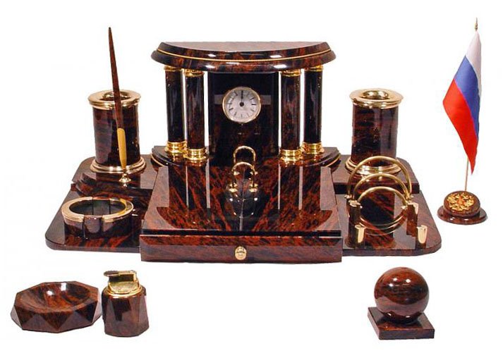 Настольный письменный набор для руководителя.. Обсидиан - очень таинственный и воистину прекрасный камень. Обсидиан является стеклом вулканического происхождения. Название камня происходит от лат. Obsidianus lapis. Темную окраску обсидиану придают железо и магний. Чаще всего обсидиан обладает черным, бурым, кирпично-красным, серо-серебристым цветом. Его окраска редко бывает однородной. Чаще всего она пятнистая, полосчатая. Астрологи считают обсидиан камнем планеты Плутон. Следуя древнейшим легендам, обсидиан предостерегает Вас от дурных поступков и совершения греха. Обсидиан охраняет своего владельца от сглаза, остерегает от отрицательных эмоций. Настольный набор из обсидиана включает в себя: Часы настольные -1шт. Подставки под письменные принадлежности -2шт. Флаг на флагштоке с гербом России -1шт. Ящик для письменных предметов -1шт. Подставка под календарь -1шт. Подставка под канцелярские мелочи -1шт. Специального отдела для бумаг -1шт. Отдела под визитки -1шт. Ручка -1шт. Шар на подставке -1шт. Пепельница -1шт. Зажигалка -1шт. По вашим пожеланиям можно изменить комплектацию набора.