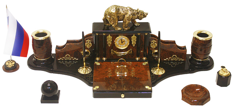 Настольный набор руководителя. Обсидиан - очень таинственный и воистину прекрасный камень. Обсидиан является стеклом вулканического происхождения. Название камня происходит от лат. Obsidianus lapis. Темную окраску обсидиану придают железо и магний. Чаще всего обсидиан обладает черным, бурым, кирпично-красным, серо-серебристым цветом. Его окраска редко бывает однородной. Чаще всего она пятнистая, полосчатая. Астрологи считают обсидиан камнем планеты Плутон. Следуя древнейшим легендам, обсидиан предостерегает Вас от дурных поступков и совершения греха. Обсидиан охраняет своего владельца от сглаза, остерегает от отрицательных эмоций. Настольный набор из обсидиана включает в себя: Часы настольные наборы с бронзовым медведем -1шт. Подставка под бумаги -2шт. Флаг на флагштоке с гербом России -1шт. Стаканы для ручек и карандашей -2шт. Визитница -2шт. Ящик для ценностей -1шт. Подставка под календарь -1шт. Ручки -2шт. Шар на подставке -1шт. Пепельница -1шт. Зажигалка -1шт. По вашим пожеланиям можно изменить комплектацию набора.