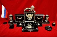 Письменный набор для руководителя из природного камня обсиди. Настольный набор из обсидиана включает в себя: Часы настольные с фигуркой льва,выполненного путем литья -1шт. Подставки под письменные принодлежности -2шт. Подставки под бумаги -2шт. Флаг на флагштоке -1шт. Визитница -2шт. Ручки -2шт. Ящик для ценностей -1шт. Подставка под календарь -1шт. Зажигалка -1шт. Пепельница -1шт. Шар на подставке -1шт.