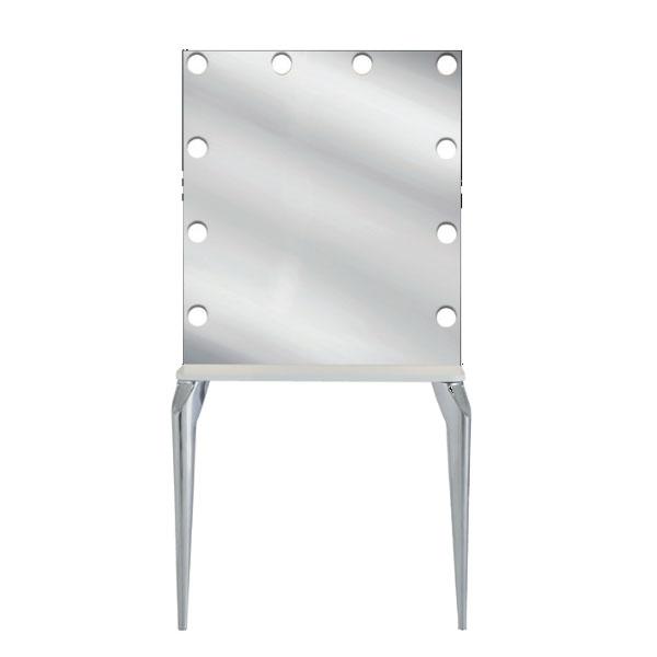 Зеркало парикмахерское для визажа с лампочками. Зеркало оснащено подсветкой, ламинированной столешницей и алюминиевыми ножками. Каркас зеркала и столешница выполнены из белого ламината. Крепление к стене.