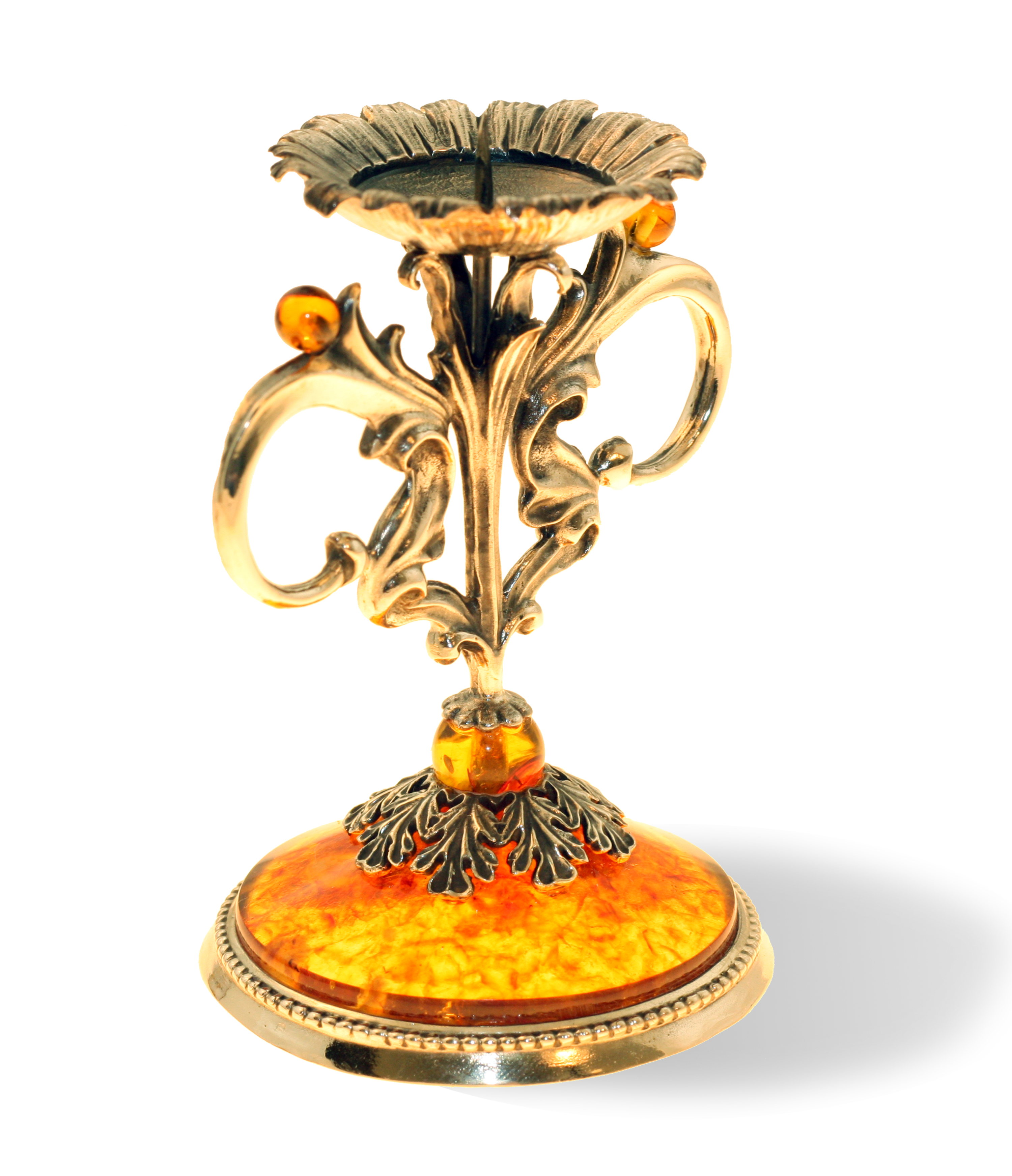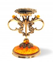 Подсвечник. Состав: янтарь, белая ювелирная бронза или серебро 875 пробы. Вес серебра в изделии - 100 гр. Высота изделия - 9 см, диаметр - 6 см. Поставляется в подарочном футляре. В случае отсутствия товара на складе срок изготовления от трех недель.