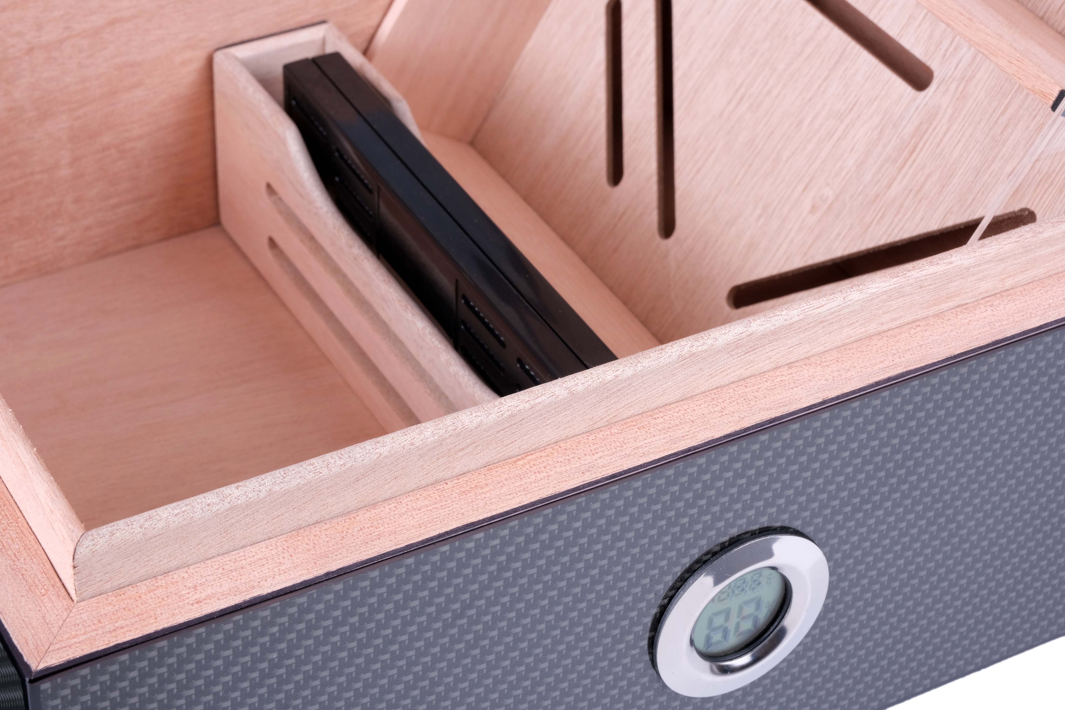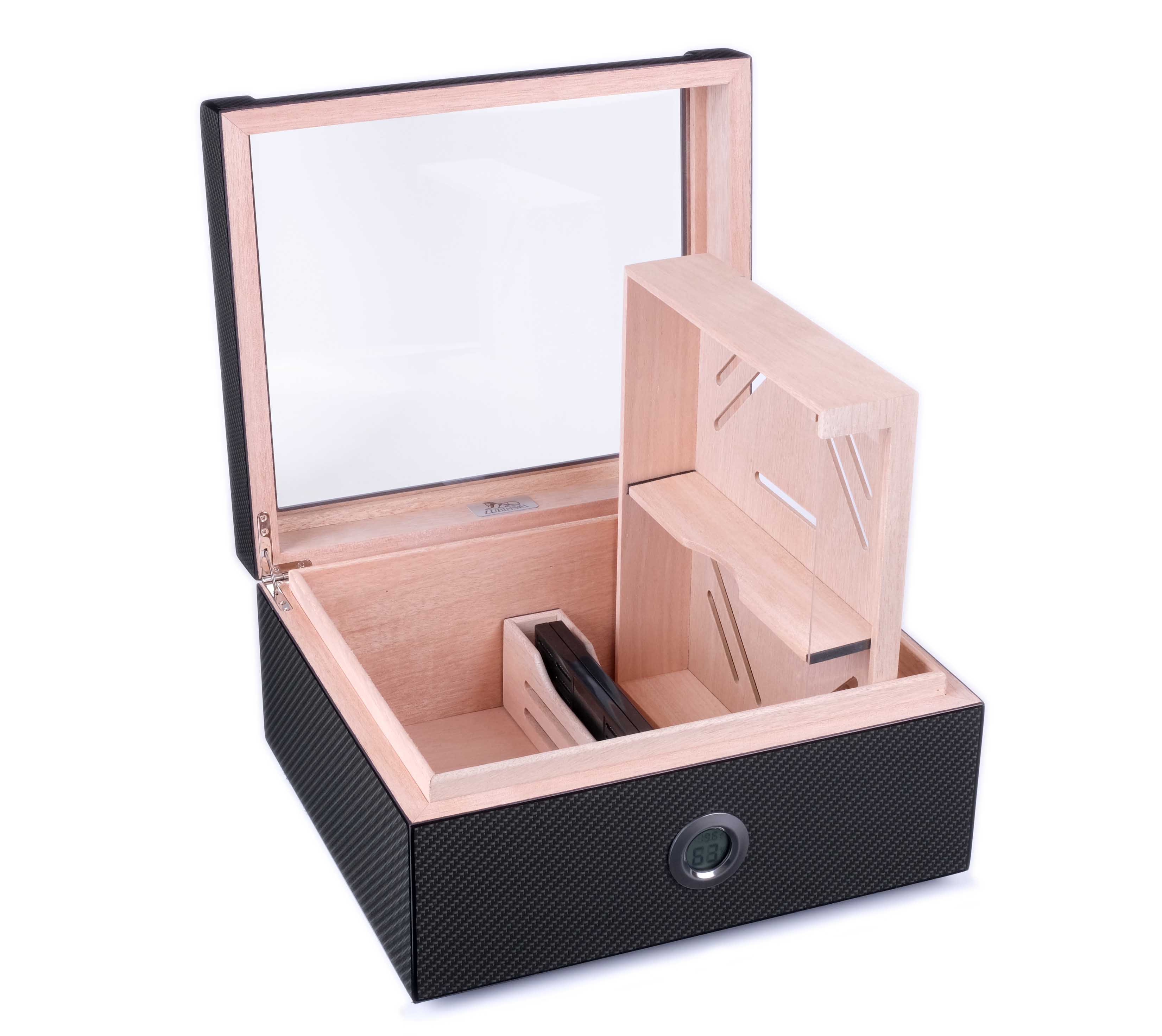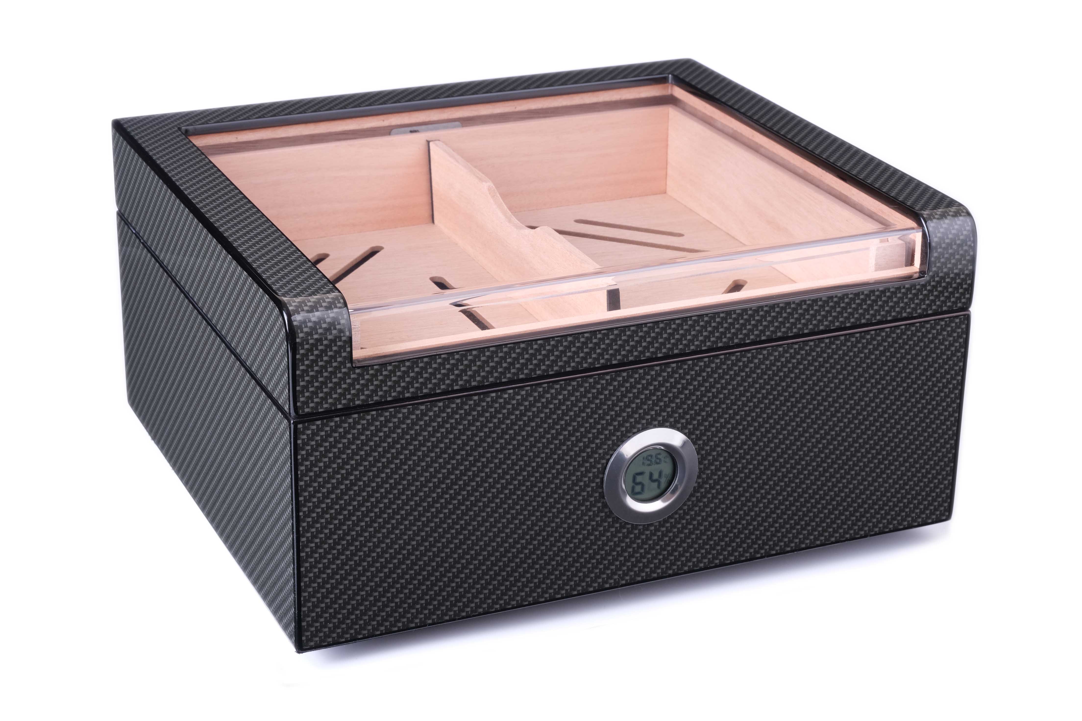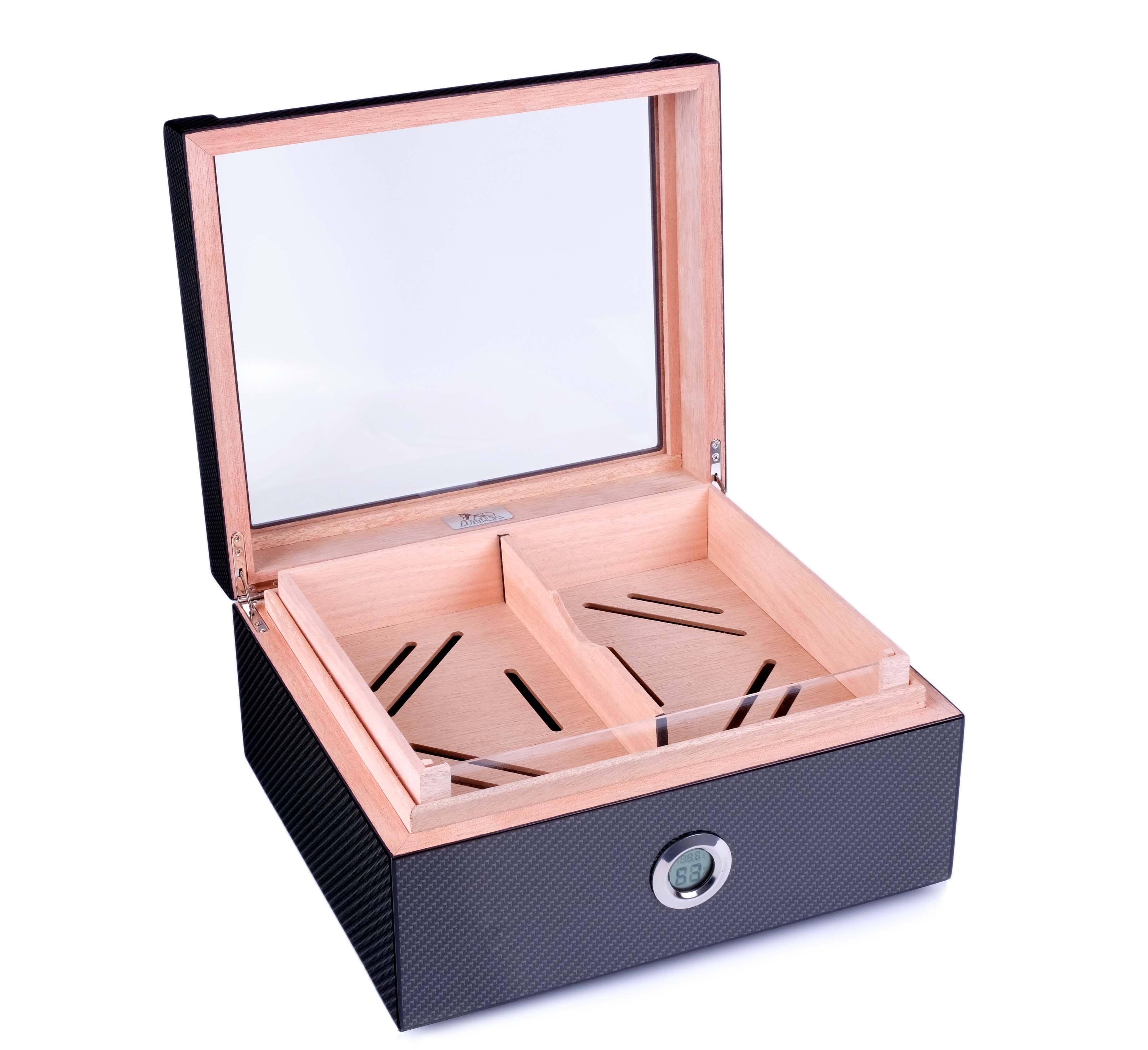 Хьюмидор lubinski на 60 сигар со стеклом, карбон. Хьюмидор премиум-класса на 60 сигар от итальянской компании Lubinski — крупнейшего производителя и дистрибьютора курительных аксессуаров в Италии (подробнее о компании и ее продукции можно узнать на сайте www.lubinski.it). Массивное изделие со строгим классическим дизайном и качественным исполнением всех деталей. Внутренняя отделка из испанского кедра. Корпус отделан Карбоном и многослойным лаком. Оборудован съемным лотком, а также калибруемым электронным термогигрометром. Увлажнитель с акриловым полимером нового поколения в съемном футляре из кедра. Подробная инструкция по эксплуатации прилагается. Производитель оставляет за собой право без предварительного уведомления вносить незначительные изменения в конструкцию или комплектацию изделия с целью улучшения его свойств. Материал Карбон, кедр Производитель Lubinski, Италия Размер 32х28х16; 28х23х13; вес 3,5 кг