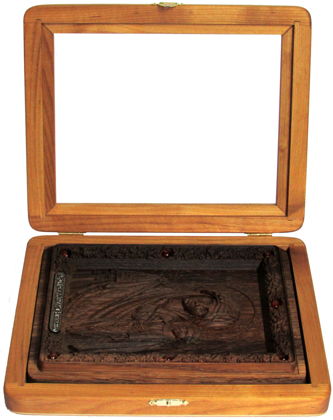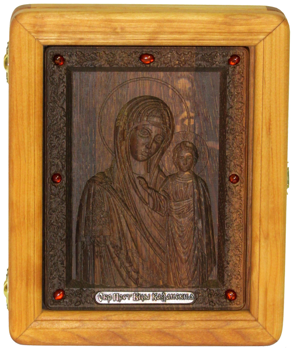 Подарочная икона "казанская икона божией матери" на мореном дубе. Явление иконы Пресвятой Богородицы во граде Казани (1579). 1 октября 1552 года, в праздник Покрова Пресвятой Богородицы, ночью, Иоанн IV, предводитель русских воинов, готовившихся к решительному штурму татарской Казани, вдруг услышал благовест московских колоколов. Царь понял, что это – знамение милости Божией: по молитвам Взбранной Воеводы Господь восхотел обратить к Себе народ казанский. Покорением Казани под покровом Пресвятой Богородицы было завершено дело, начатое в 1164 году святым князем Андреем Боголюбским († 1174; память 4 июля). Волга – главный водный путь страны – стала русской рекой. Из татарского плена было освобождено 60 000 русских людей. Началось просвещение татар светом Евангельской истины. Явились первые мученики – святые Петр и Стефан (память 24 марта). Новоучрежденная Казанская епархия вошла в состав Русской Церкви и вскоре просияли своими архиепископами: святителем Гурием († 1563; память 5 декабря) и святителем Германом († 1567; память 6 ноября). Но особенно способствовало возвышению Православия среди волжских магометан явление в городе Казани 8 июля 1579 года чудотворной иконы Божией Матери. Трудно шло дело проповеди Евангелия в покоренном царстве среди закоренелых мусульман и язычников. Пресвятая Богородица, покровительница проповедников Слова Божия, еще в земной Своей жизни разделявшая со святыми Апостолами благовестнические труды, видя старания русских миссионеров, не замедлила послать им Небесную помощь, явив Свою чудотворную икону. 28 июня 1579 года страшный пожар, начавшийся около церкви святителя Николая Тульского, истребил часть города и обратил в пепел половину Казанского Кремля. Злорадствовали поклонники Магомета, думая, что Бог прогневался на христиан. «Вера Христова, – говорит летописец, – сделалась притчею и поруганием». Но пожар в Казани явился предзнаменованием окончательного падения ислама и утверждения Православия на всей златоордынской земле, будущем Востоке Русского государства. Город вскоре начал вставать из руин. Вместе с другими погорельцами, недалеко от места начала пожара строил дом стрелец Даниил Онучин. Его девятилетней дочери Матроне явилась в сонном видении Божия Матерь и повелела достать Ее икону, зарытую в земле еще при господстве мусульман тайными исповедниками Православия. На слова девочки не обратили внимания. Трижды являлась Богородица и указывала место, где укрыта чудотворная икона. Наконец, Матрона со своей матерью стали рыть в указанном месте и обрели святую икону. На место чудесного обретения прибыл во главе духовенства архиепископ Иеремия и перенес святой образ в близрасположенный храм во имя святителя Николая, откуда, после молебна, перенесли его с Крестным ходом в Благовещенский собор – первый православный храм города Казани, воздвигнутый Иоанном Грозным. Во время шествия получили исцеление два слепца – Иосиф и Никита. Список с иконы, явленной в Казани, изложение обстоятельств ее обретения и описание чудес были посланы в 1579 году в Москву. Царь Иоанн Грозный повелел устроить на месте явления храм в честь Казанской иконы Божией Матери, где и поместили святую икону, и основать женский монастырь. Матрона и ее мать, послужившие обретению святыни, приняли постриг в этой обители. В Никольском храме, где был со