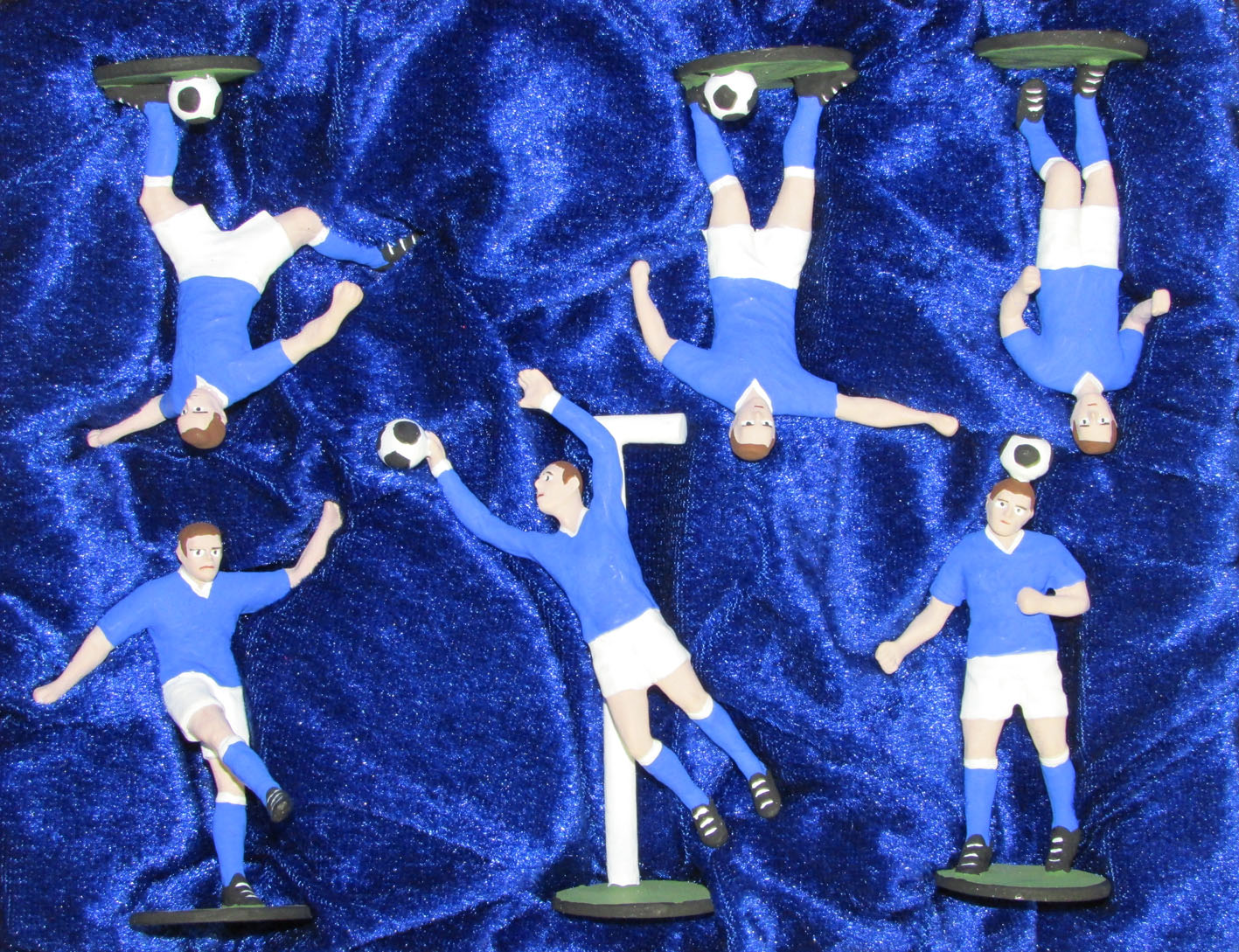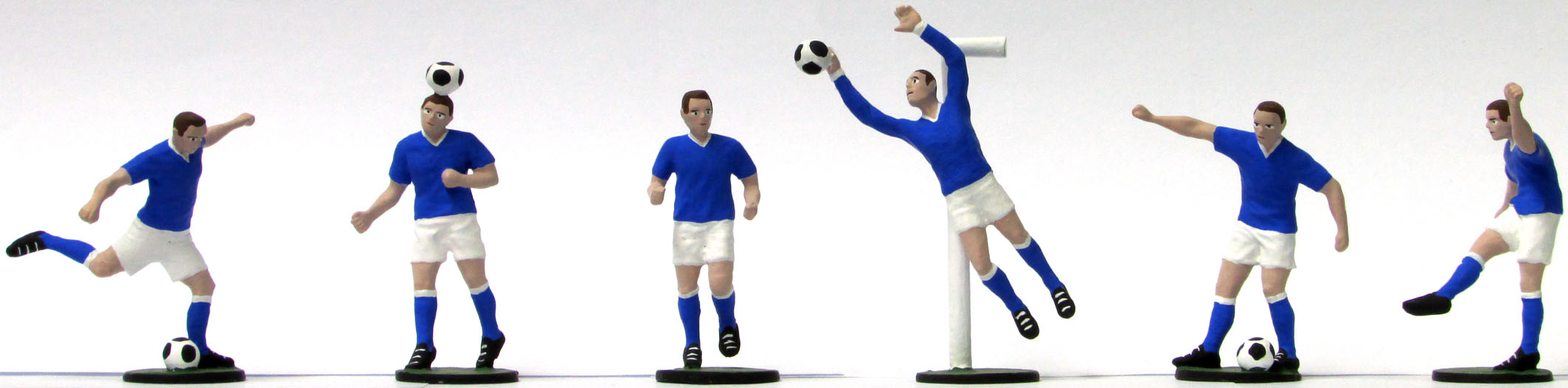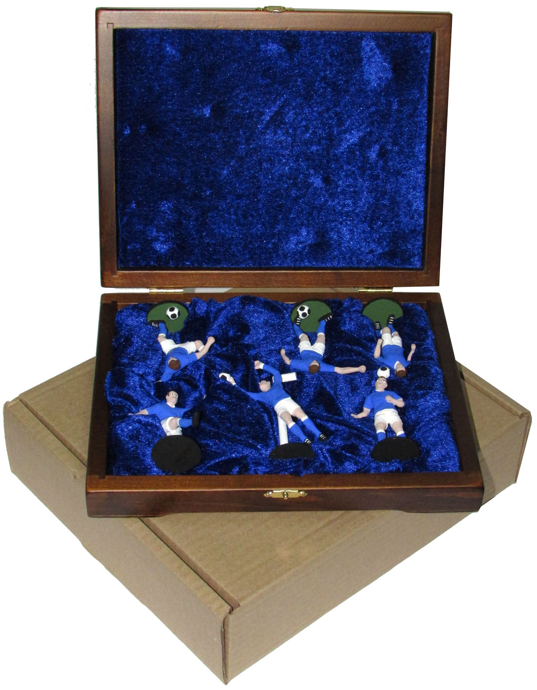 Набор миниатюр в деревянной шкатулке "футбол" 6 фигур (сине-бела. Артикул: RAZ-11 Наименование: Набор миниатюр в деревянной шкатулке ФУТБОЛ 6 фигур (сине-белая форма) Размер: 23 х 19 х 5 см Описание: Материал: Цинковый сплав Технология: Литьё / Ручная роспись Набор из шести раскрашенных вручную цинковых миниатюр, представляющих яркие игровые моменты одной из самых любимых в нашей стране спортивной игры. Высота футболиста от бутс до головы 63-64 мм. Изначально фигуры разрабатывались как шахматные, но как показали продажи, в виде набора фигрок они более востребованы. Номера и фамилии игроков на футболки не нанесены, но легко могут быть нанесены покупателем с помощью темперных красок. Набор является красивым мужским подарком, ориентированным на любую возрастную аудиторию.Поставляется в полированной шкатулке из березы, тонированной под орех. Шкатулка легко персонализируется практически любым способом.Упаковка: транспортная картонная коробка из бурого картона.