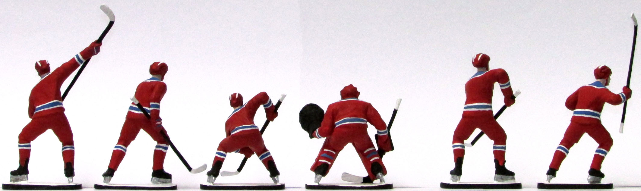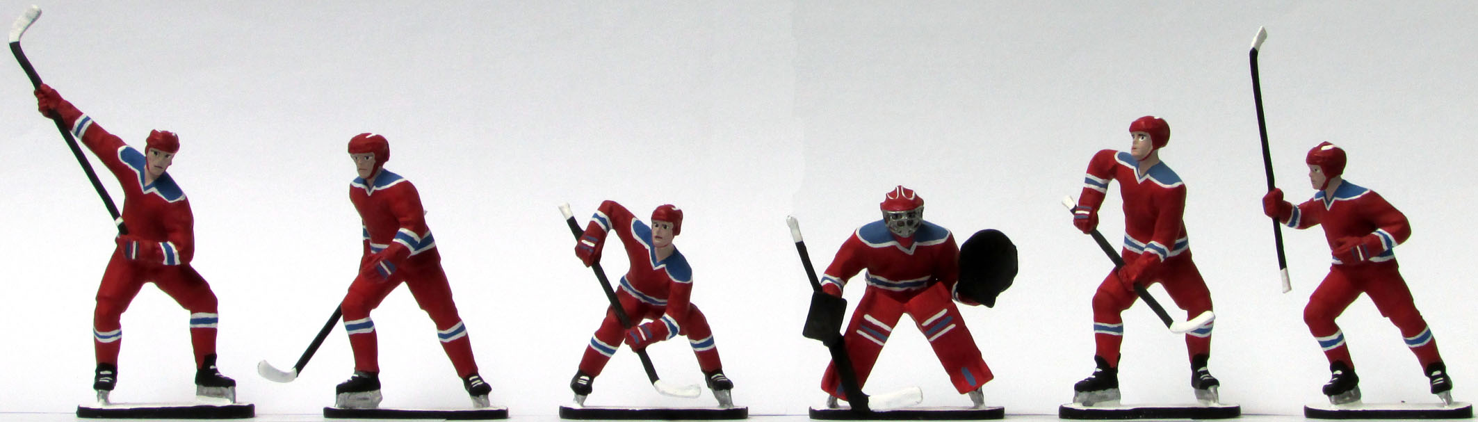 Набор из шести раскрашенных вручную цинковых миниатюр, представляющих яркие игровые моменты одной из самых любимых в нашей стране спортивной игры. Высота хоккеиста от конька до каски 75 мм. Изначально фигуры разрабатывались как шахматные, но как показали продажи, в виде набора фигрок они более востребованы. Номера и фамилии игроков на форму не нанесены, но легко могут быть нанесены покупателем с помощью темперных красок.