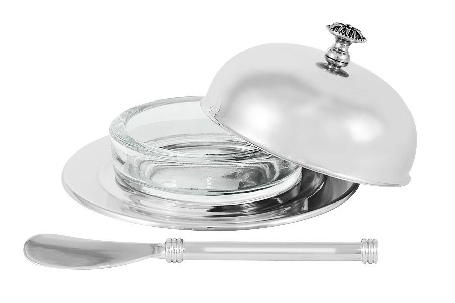 Блюдце-подставка, масленка стеклянная, крышка, нож для масла