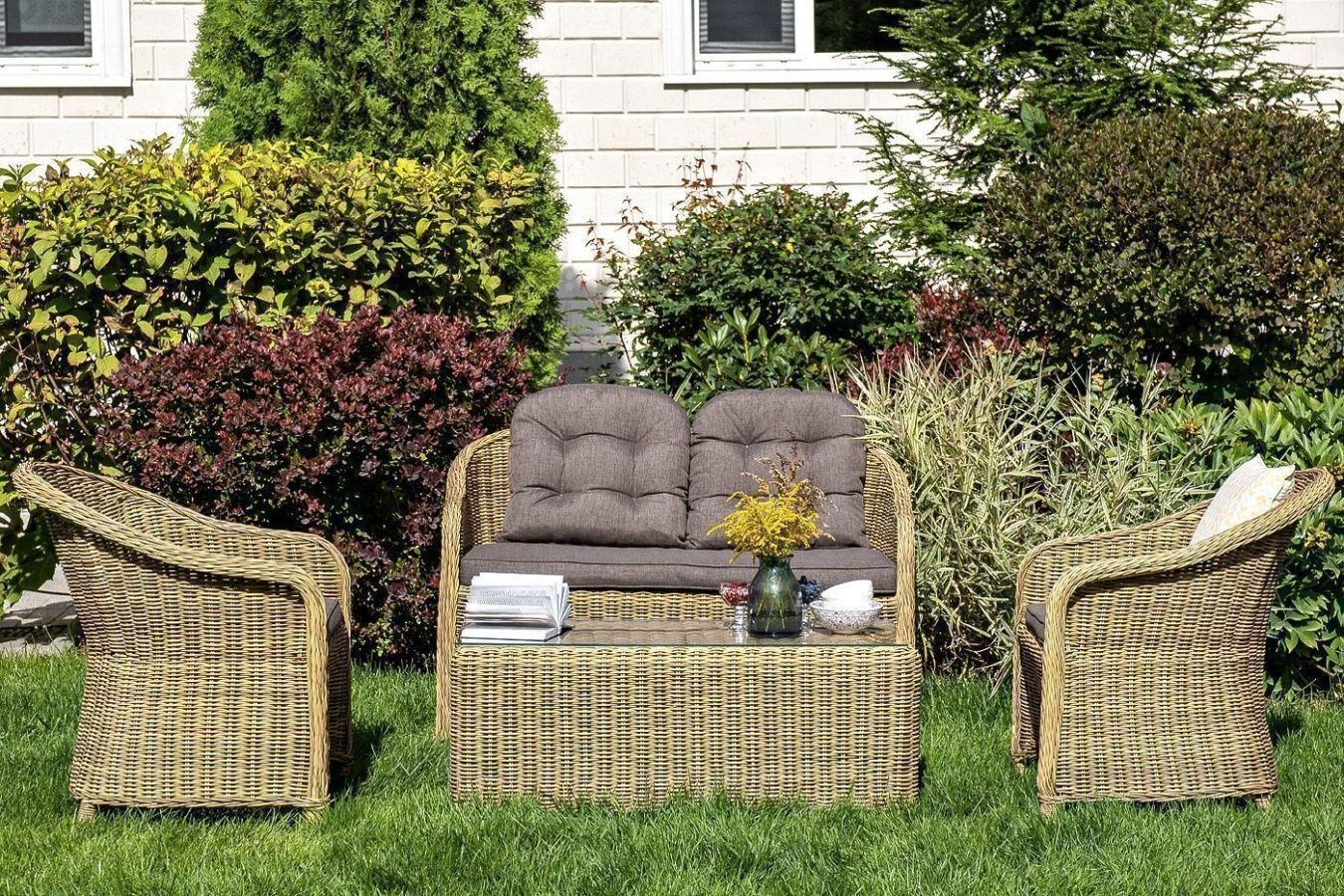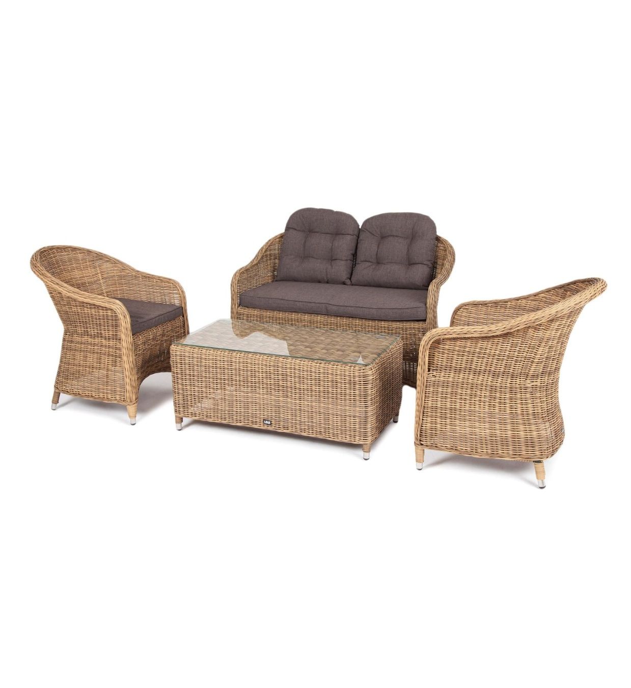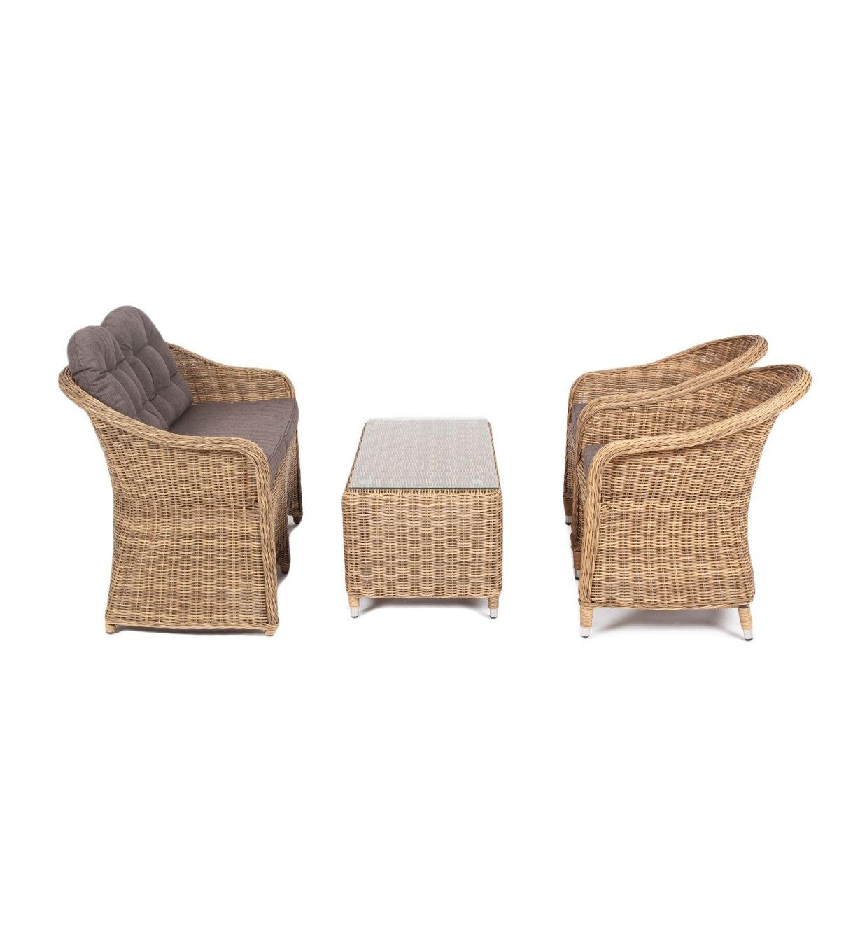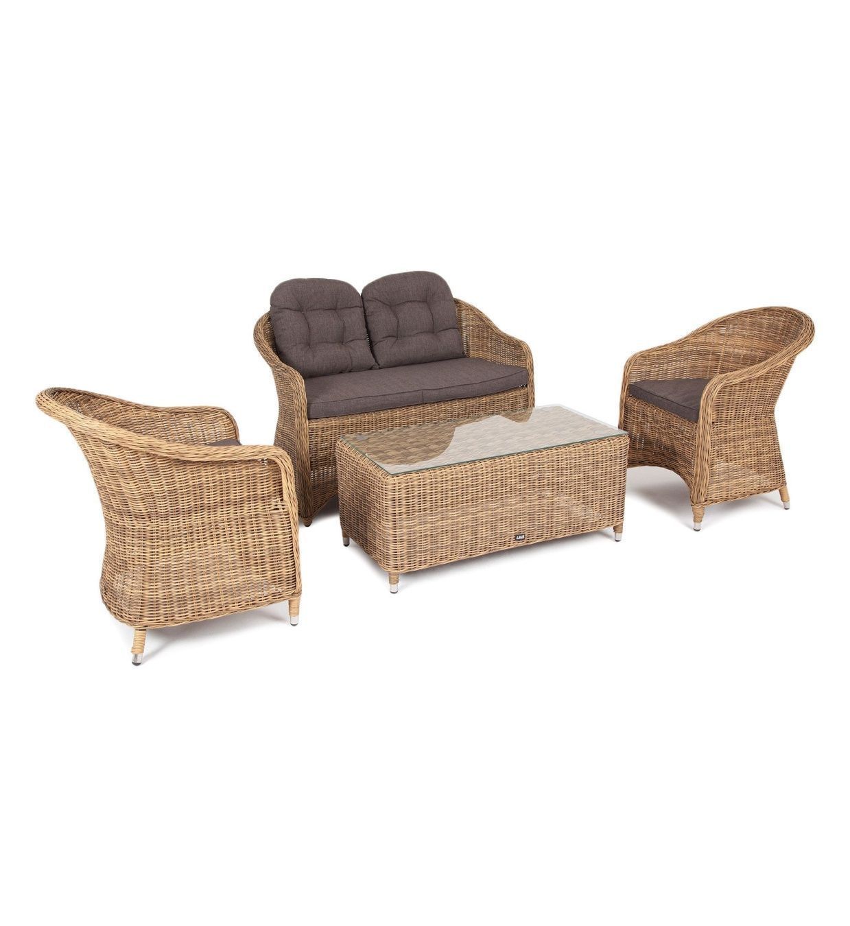 Равенна лаунж-зона из искусственного ротанга, цвет соломенный. Комплект для лаунж-зоны Равенна рассчитан на 4 персоны. В состав водят: - 2 кресла - 680x570x810 мм - журнальный столик - 1000x500x420 мм - двухместный диван - 1160x680x810 мм Комплект выполнен из круглого искусственного ротанга соломенного цвета. Каркас - из легкого и прочного алюминия. Подушки со съемными чехлами - из 100 #37; полиэстера, плотностью 230гр/м2 с влагоотталкивающей пропиткой. Вид ротанга круглый Цвет плетения соломенный Цвет подушки серый Материал каркаса (стул/кресло/диван) алюминий Материал плетения искусственный ротанг Материал подушки полиэстер 100% плотностью 230гр/м2 с влагоотталкивающей пропиткой Габариты упаковки (ДШВ) 190/81/120 Вес (Брутто) 76 Вес (Нетто) 46.5кг