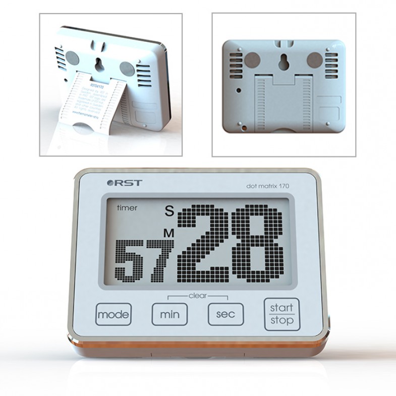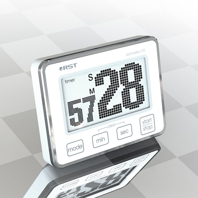 Цифровой таймер-секундомер dt170. Производитель: RST Sweden Длина: 70 мм x Ширина: 53 мм x Высота: 10 мм Артикул: RST04170 Технические характеристики Питание 1 x 3V CR2032 Дизайн, исполнение Цвет корпуса белый, хром Точечно-матричный дисплей с анимацией цифр. 2 функций в одном устройстве: таймер и секундомер. Память на последнию установку. Простая и удобная настройка при помощи 4-х кнопок. Режим отсчёта опаздывания таймера от установленного времени. Режим установки целевого времени для секундомера. Секундомер отсчитывает время с разрешением до 1 секунды. Громкий сигнал зумера при достижении установленного времени, длительностью 60 секунд. Контрастный жидкокристаллический дисплей. Может быть установлен в любом месте, имеет настольную подставку, магнит для крепления на металлическую поверхность, возможность повесить на верёвку.
