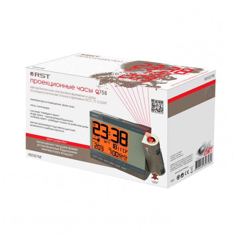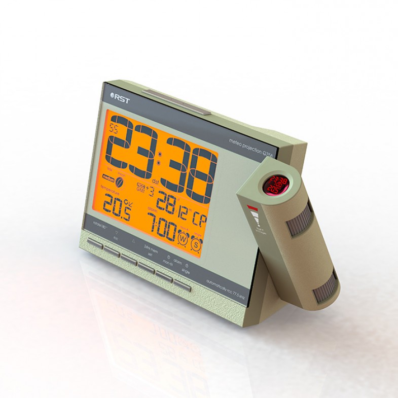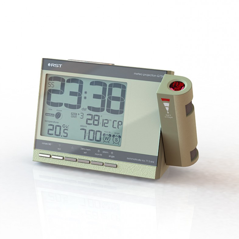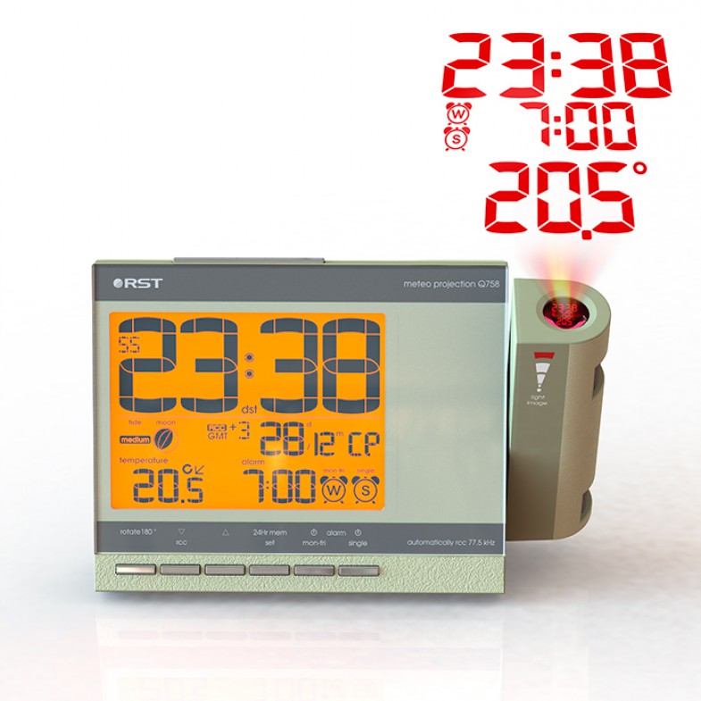 Проекционные часы-будильник meteo projection q758. Производитель: RST Sweden Длина: 155 мм x Ширина: 100 мм Артикул: RST32758 Технические характеристики Диапазон измеряемых температур в помещении, градусов С -10...+50 Разрешение, C 0.1 Питание батарея 2 х 1,5 В типа AA и/или сетевой адаптер 220 В, 50 Гц/7,5 В, 100 мА Дизайн, исполнение Цвет корпуса шампань Подсветка дисплея оранжевая, крещендо Проекционные часы выполнены в стильном дизайне RST. Яркая регулируемая в повороте и направлении проекция времени, температуры и будильника на стену или потолок. Точное время и дата синхронизируются с сигналами точного времени rcc 77,5*. календарь с указанием дня недели. Анимированный лунный календарь с силой приливов и отливов, температура внутри помещения, тенденция ее изменения, температура отображается в градусах Цельсия, автоматическое запоминание максимального и минимального зарегистрированных значений температур внутри помещения, индикатор состояния батареек базовой станции, возможность работы без элементов питания, в этом случае необходимо подключить сетевой адаптер. Приятная мягкая оранжевая подсветка дисплея.· rcc 77.5 (DCF77) UTC/GMT - интеллектуальная технология разработанная компанией RST позволяет в автоматическом режиме произвести настройку метеостанции. При приёме данных от радио датчика находящегося возле окна (в зоне благоприятной для принятия радиосигналов rcc), базовая станция получает информацию не только о температуре на улице а также точное время и текущую дату и автоматически настраивается. Передатчик rcc 77.5 (DCF77) находится в Майнфлингине, (Германия, в 25 км к юго-востоку от Франкфурта-на-Майне) и работает на частоте 77,5 кГц с мощностью 50 кВт.