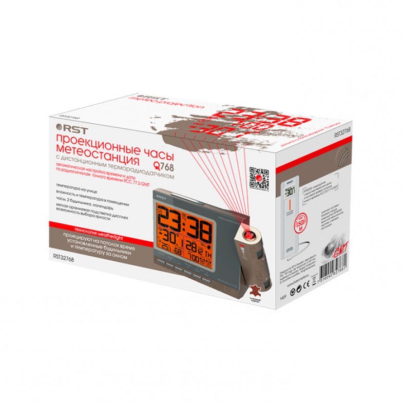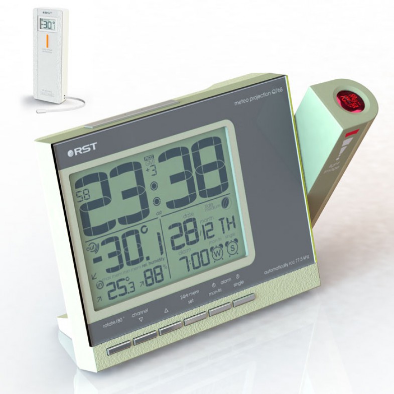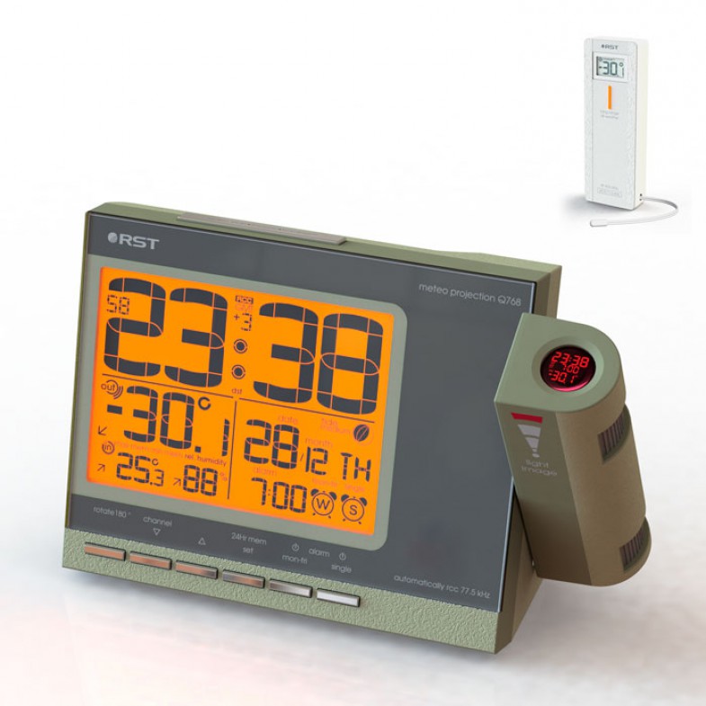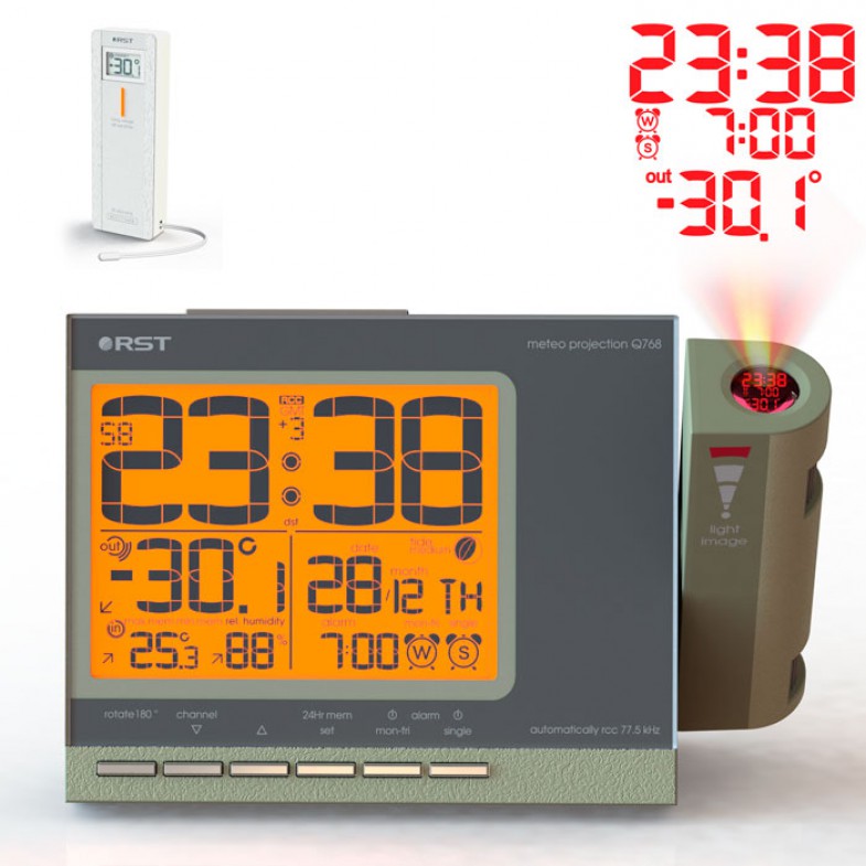 Проекционные часы c радиодатчиком meteo projection q768. Производитель: RST Sweden Длина: 155 мм x Ширина: 100 мм Артикул: RST32768 Технические характеристики Температура в помещении + Температура снаружи + Диапазон измеряемых температур в помещении, градусов С -10...+50 Диапазон измеряемых температур снаружи, C -50...70 Разрешение, C 0.1 Относительная влажность воздуха + Диапазон измеряемой влажности в помещении, % rH 20...99 Разрешение, %rH 1 Радиодатчик, возможное количество RST02252 x 1 Время + Календарь + Будильник + 2 интеллектуальные Питание батарея 2 х 1,5 В типа AA и/или сетевой адаптер 220 В, 50 Гц/7,5 В, 100 мА Дизайн, исполнение Цвет корпуса графит/шампань Подсветка дисплея оранжевая, крещендо Проекционные часы получают данные о внешней температуре от дистанционного радиодатчика RST02252. Яркая регулируемая в повороте и направлении проекция времени, внутренней и внешней температуры и будильника на стену или потолок. Точное время и дата синхронизируются с сигналами точного времени rcc 77,5*. календарь с указанием дня недели. Анимированный лунный календарь с силой приливов и отливов, температура и относительная влажность внутри помещения, внешняя температура, тенденция изменения всех параметров, температуры отображаются в градусах Цельсия, автоматическое запоминание максимального и минимального зарегистрированных значений температур, индикатор состояния батареек базовой станции, возможность работы без элементов питания, в этом случае необходимо подключить сетевой адаптер. Приятная мягкая оранжевая подсветка дисплея. · rcc 77.5 (DCF77) UTC/GMT - интеллектуальная технология разработанная компанией RST позволяет в автоматическом режиме произвести настройку метеостанции. При приёме данных от радио датчика находящегося возле окна (в зоне благоприятной для принятия радиосигналов rcc), базовая станция получает информацию не только о температуре на улице а также точное время и текущую дату и автоматически настраивается. Передатчик rcc 77.5 (DCF77) находится в Майнфлингине, (Германия, в 25 км к юго-востоку от Франкфурта-на-Майне) и работает на частоте 77,5 кГц с мощностью 50 кВт.