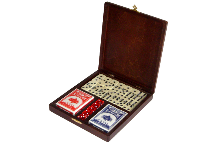 Артикул: [RT-04.s] Наименование: Набор игр в деревянной шкатулке Размер: 23 х 20 см Описание: Материал: Береза Технология: Тонирование и полировкаОдин из самых законченных игровых наборов. В его комплектацию входят наиболее распространенные в России игры: - Комплект костей для Домино - Две колоды пластифицированных карт для Покера с разными по цвету рубашками (карты легко подходят для сотен других карточных игр, для пасьянсов, для гаданий и т.п.) - Набор из пяти костей для игр в любые настольные игры Весь набор упакован в полированную деревянную шкатулку из березы, тонированной под орех. Упаковка: транспортная картонная коробка.