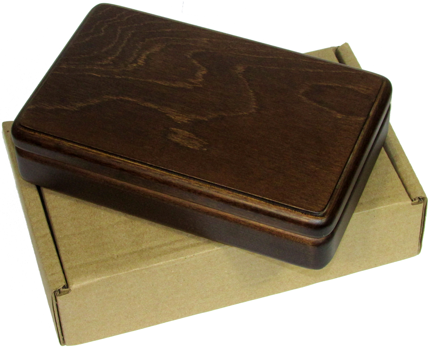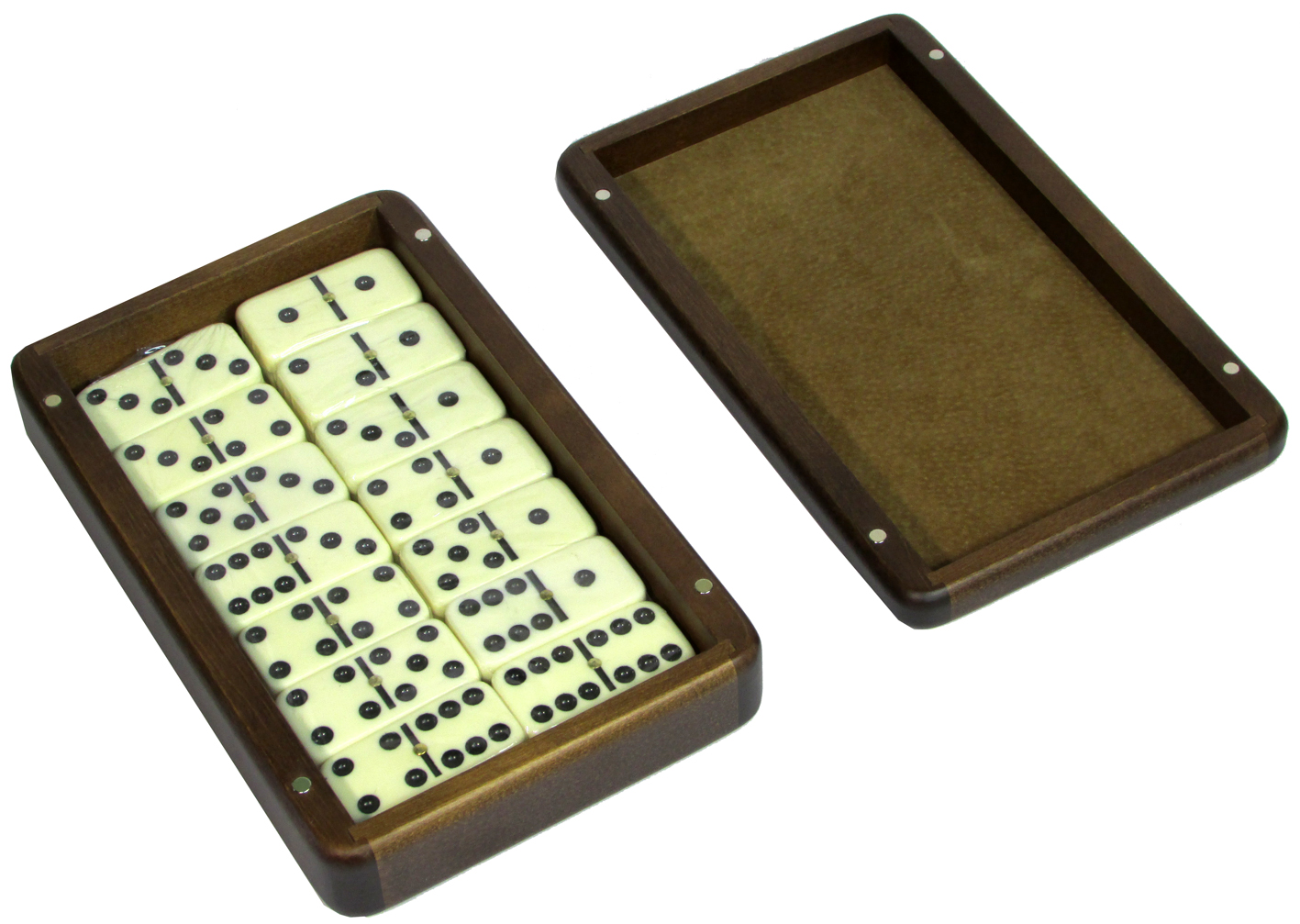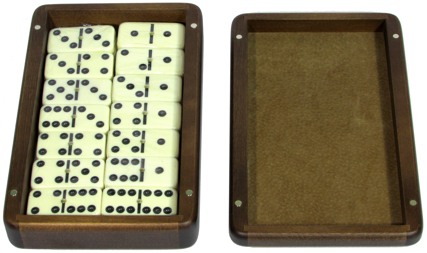 Комплект из 28 костей для игры в домино с черными точками и шариком для перемешивания на каждой единице в полированной шкатулке из массива березы, тонированной под орех.