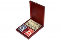 Артикул: [RT-24.s] Наименование: Набор игр в деревянной шкатулке Размер: 23 х 20 см Описание: Материал: Береза Технология: Тонирование и полировкаОдин из самых законченных игровых наборов. В его комплектацию входят наиболее распространенные в России игры: - Комплект костей для Домино - Две колоды пластифицированных карт для Покера с разными по цвету рубашками (карты легко подходят для сотен других карточных игр, для пасьянсов, для гаданий и т.п.) - Набор из пяти костей для игр в любые настольные игры Весь набор упакован в полированную шкатулку из березы, тонированной под красное дерево. Упаковка: транспортная картонная коробка.