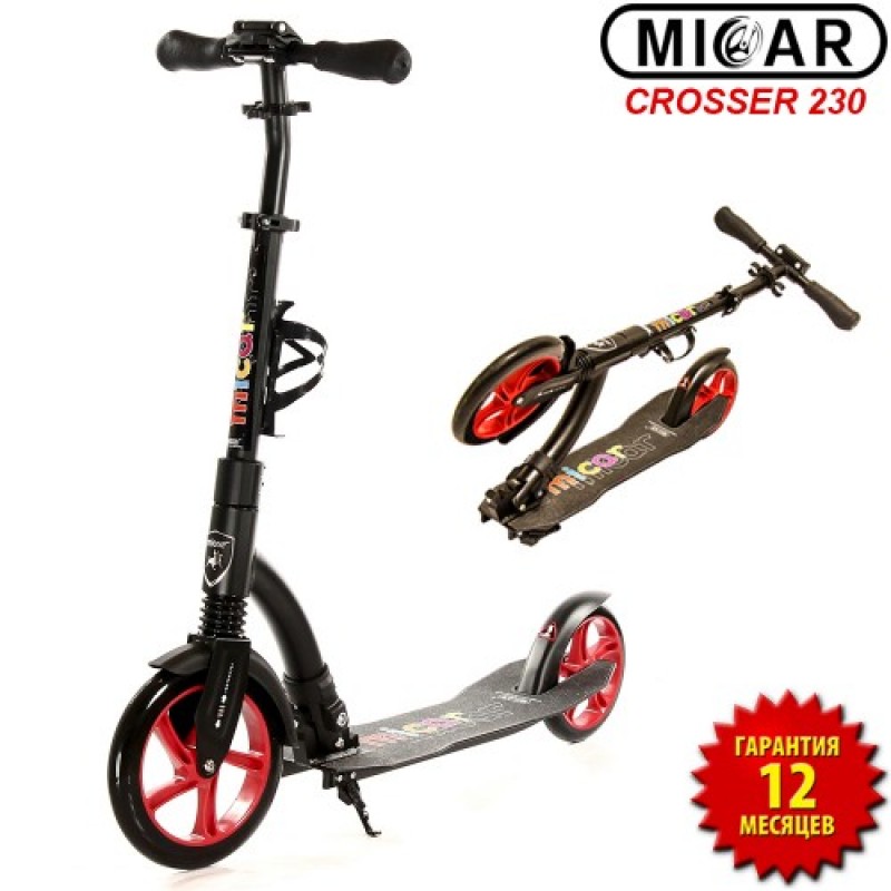 Двухколёсный самокат micar crosser 230 чёрный. Вес самоката 5 кг Вес самоката в коробке 6 кг Возрастная категория от 6 лет Высота шасси 60 мм Гарантия производителя 1 год Максимальная нагрузка 100 кг Материал Алюминиевый сплав Размер колёс 230 мм и 180 мм Размеры в разложенном виде 950х370х1100мм Размеры в сложенном виде 880х150х400мм Размеры коробки - Д x Ш x В 910х155х410мм