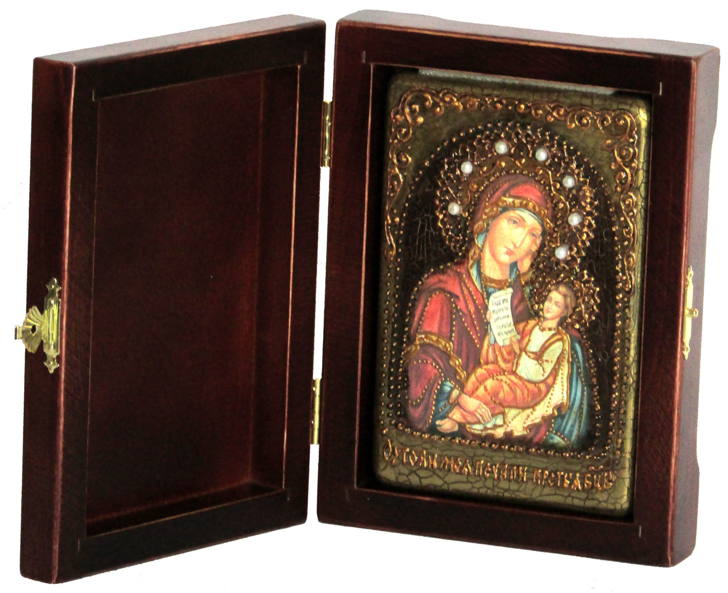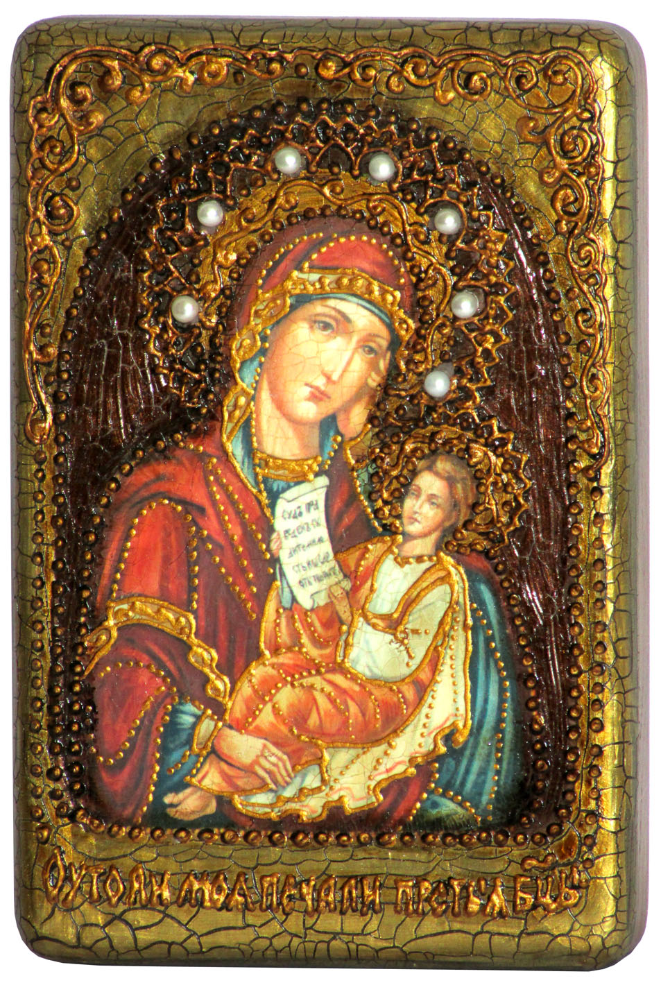 Настольная икона "образ божией матери "утоли моя печали" на. Тот смысл, какой соединяется с названием иконы Божией Матери «Утоли моя печали», прекрасно объясняется нам самой св. церковью в тех песнопениях и молитвословиях, которые составлены в честь этой святой иконы. В тропаре праздника мы обращаемся к Пресвятой Деве Марии со следующими словами: «Утоли болезни многовоздыхающия души моея, Утолившая всяку слезу от лица земли, Ты бо человеком болезни отгониши и грешным скорби разрушавши; Тебе бо вси стяжахом надежду и утверждение, Пресвятая Мати Дево». «Избранное нам — читаем в кондаке праздника — и дивное даровася избавление — образ Твой честный, преблагословенная Владычице Дево Богородице, яко избавльшеся от злых явлением его, к нему же взирающе восписуем Ти благодарственная раби Твои, Богородице. Но яко имущая державу непобедимую от всяких нас бед свободи, да зовем Ти: радуйся, радосте наша! избави нас от всякого зла и утоли наша печали». Последние слова кондака: «Радуйся, радосте наша! избави нас от всякого зла и утоли наша печали» — служат в то же время и припевом акафиста. Мысль, почему икону Божией Матери наименовали «Утоли моя печали», становится еще более ясной из особой молитвы, составленной св. Церковью для верующих, обращающихся за помощью к Пресвятой Богородице. Вот эта молитва: «Надежда всем концем земным Ты еси, Пречистая Дево Госпоже Богородице, утешение мое! не гнушайся мене, скверного, в дерзновенном молении недостойных уст моих, и молю: угаси ми пламень греховный и ороси покаянием, иссохшее сердце мое от мрака греховного очисти, ум от лукавых помыслов, душевныя и телесныя язвы исцели, облегчи, Владычице, болезнь, утиши бурю злых нападений, Пречистая, отъими бремя грехов моих, Преблагая, и утоли печали моя, сокрушающия сердце. Ты бо еси возведение роду человеческому и в печалех скорая Утешительница. За толикия же Твоя милости до последнего моего издыхания славословити Тя имам, о Всеблагословенная! Аминь». Из приведенных слов тропаря, кондака и молитвы можно заключить, что название «Утоли моя печали» — есть ни что иное, как молитва к Божией Матери об избавлении от многочисленных болезней и скорбей телесных и в особенности душевных, т. е. греховных страстей, обуревающих сердце. В жизни, полной невзгод, кто не испытывал скорби? Кто может сказать о себе, что он на своем жизненном пути не переживал тяжелых минут несчастья и не искал ниоткуда себе поддержки или утешения? Нет такого человека... И истинный христианин, при всех тяжелых и печальных обстоятельствах своей временной земной жизни, невольно мысленно обращается туда, откуда он ждет помощи: духовный взор его устремляется к небу, к Пресвятой Деве Марии, и уста его шепчут мольбу: «Утоли моя печали, сокрушающие сердце мое, ибо Ты — скорая Утешительница!..» И, действительно, не от людей, таких же немощных по своей природе, как и сам страдающий, этот последний получает истинное лекарство, исцеляющее от душевных и даже телесных болезней, но от Самого Господа по ходатайству пред Ним Пресвятой Богоматери. Нет необходимости здесь говорить о всех благодеяниях Пресвятой Девы Марии, оказанных Ею роду человеческому. Они неисчислимы. Укажем лишь некоторые из них, которые так или иначе соединены с образом Богоматери, именуемым «Утоли моя печали». Но прежде всего несколько слов о са