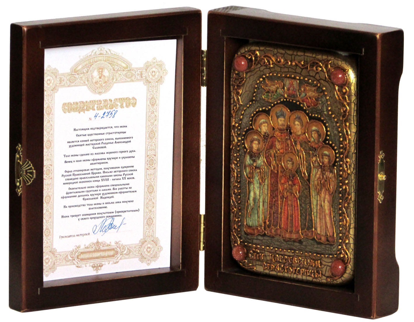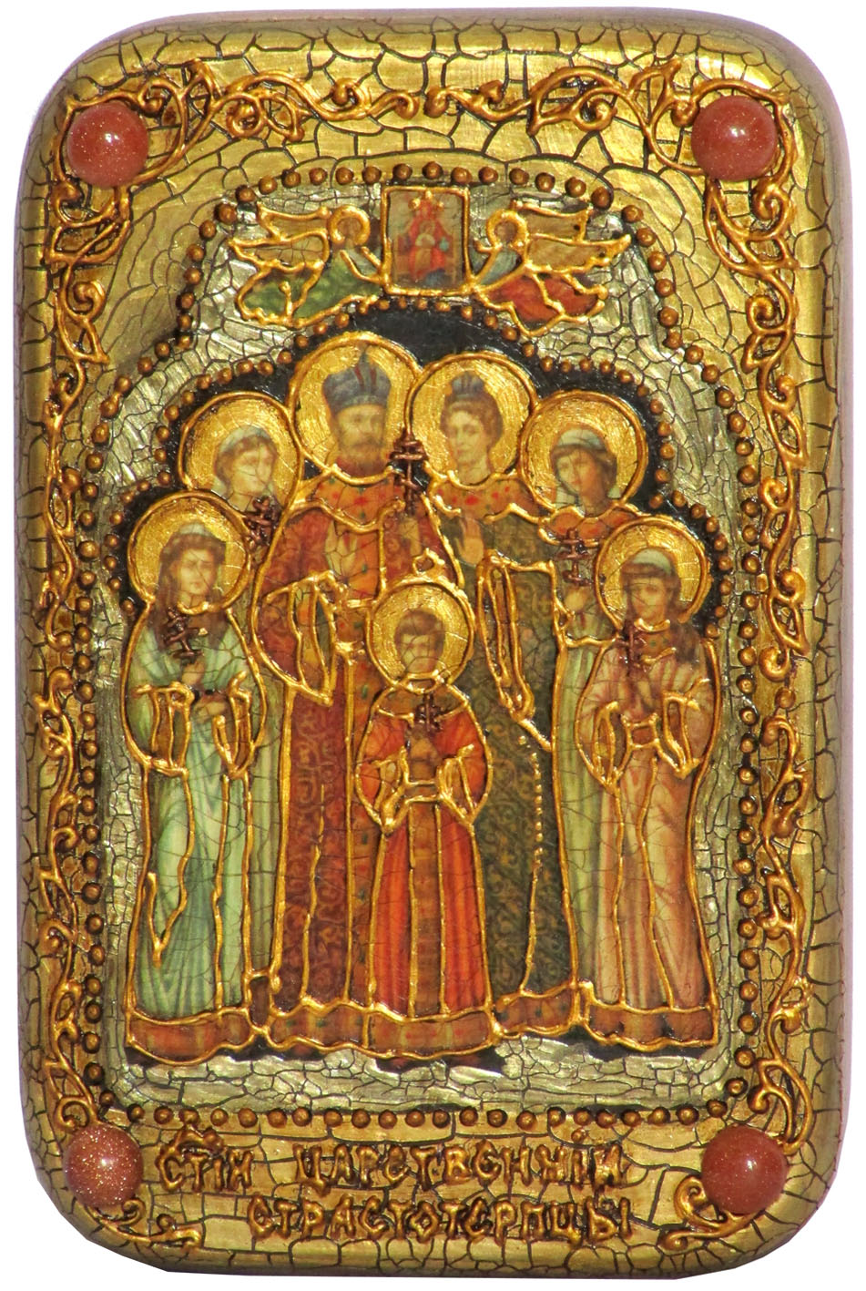 Настольная икона "святые царственные страстотерпцы" на мореном д. Царственные страстотерпцы, Царственные мученики, Царская семья — так после причисления к лику святых Русская Православная Церковь называет последнего российского императора Николая II и его семью: императрицу Александру Федоровну, царевича Алексея, великих княжен Ольгу, Татьяну, Марию и Анастасию. Они были канонизированы за подвиг мученичества — в ночь с16 на 17 июля 1918 года по приказу большевиков их вместе с придворным врачом и слугами расстреляли в доме Ипатьева в Екатеринбурге. «Страстотерпец» — это один из чинов святости. Это святой, принявший мученическую смерть за исполнение Божиих Заповедей, и чаще всего — от рук единоверцев. Важная часть подвига страстотерпца — то, что мученик не держит зла на мучителей и не сопротивляется. Это лик святых, пострадавших не за свои поступки или не за проповедь Христа, а за то, кем они были. Верность страстотерпцев Христу выражается в их верности своему призванию и предназначению. Память святых Страстотерпцев императора Николая II, Императрицы Александры, царевича Алексия, великих княжен Ольги, Татианы, Марии, Анастасии совершается в день их убийства — 17 июля по новому стилю Убийство семьи Романовых Последний российский император Николай II Романов отрекся от престола 2 марта 1917 года. После отречения его вместе с семьей, врачом и слугами заключили под домашний арест во дворце в Царском селе. Потом, летом 1917-го, Временное правительство отправило узников в ссылку в Тобольск. И наконец весной 1918 года большевики сослали их в Екатеринбург. Именно там в ночь с 16 на 17 июля Царскую семью расстреляли — по постановлению исполкома Уральского областного Совета рабочих, крестьянских и солдатских депутатов. Некоторые историки считают, что приказ на расстрел был получен напрямую от Ленина и Свердлова. Вопрос, так ли это, — спорный, возможно, исторической науке еще предстоит узнать правду. О екатеринбургском периоде ссылки Царской семьи известно очень мало. До нас дошло несколько записей в дневнике императора; есть показания свидетелей по делу об убийстве Царской семьи. В доме инженера Ипатьева Николая II с семьей охраняли 12 солдат. По сути, это была тюрьма. Заключенные спали на полу; надзиратели часто были жестоки с ними; узникам разрешалось гулять в саду всего один раз в день. Царственные страстотерпцы мужественно принимали свою участь. До наш дошло письмо княжны Ольги, где она пишет: «Отец просит передать всем тем, кто ему остался предан, и тем, на кого они могут иметь влияние, чтобы они не мстили за него, так как он всех простил и за всех молится, и чтобы не мстили за себя, и чтобы помнили, что то зло, которое сейчас в мире, будет еще сильней, но что не зло победит зло, а только любовь». Арестованным разрешали присутствовать на богослужениях. Молитва была для них великим утешением. Последнюю службу в Ипатьевском доме протоиерей Иоанн Сторожев совершил всего за несколько дней до расстрела Царской семьи — 14 июля 1918 года. В ночь с 16 на 17 июля чекист и руководитель расстрела Яков Юровский разбудил императора, его супругу и детей. Им велели собраться под предлогом, что в городе начались волнения и нужно срочно перейти в безопасное место. Узников сопроводили в полуподвальную комнату с одним зарешеченным окном, где Юровский сообщил Государю: «Ник