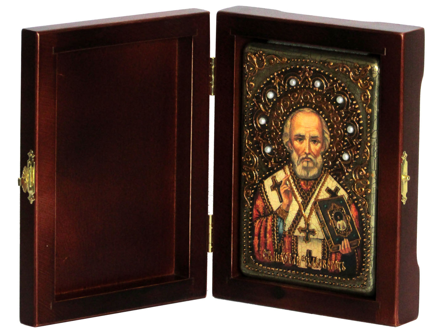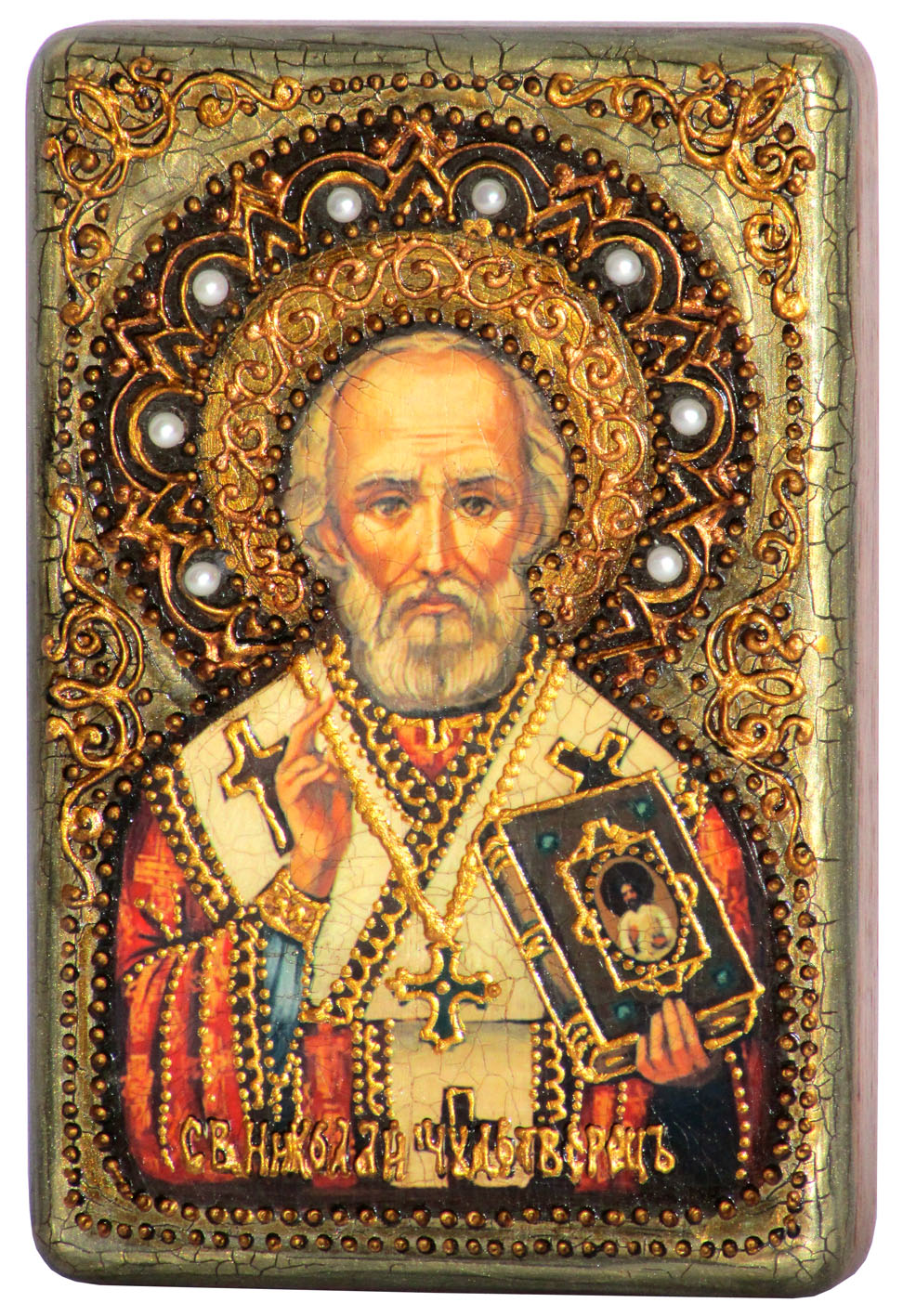 Настольная икона "святитель николай, архиепископ мир ликийский (мирли. Икона Николая Чудотворца - одна из самых почитаемых. Святителя Николая (ок. 270 — ок. 345) называют также Николай Угодник и Николай Чудотворец. Это христианский святой, архиепископ Мир Ликийских в Византии. Его почитают как чудотворца, покровителя моряков, купцов и детей. Святому Николаю молятся об исцелении, помощи в разных бедах, о добрых отношениях в семье, благополучии в пути, молятся за детей, о защите вдов и сирот, о благополучном плавании, о помощи в бедности и нужде, от грусти и уныния. Ещё при жизни святитель Николай Чудотворец прославился как защитник невинно осуждённых, умиротворитель враждующих и избавитель от напрасной смерти. Икона выполнена на натуральной деревянной доске, изготовленной из массива мореного дуба. Образ откопирован с авторского списка методом. получившим одобрение русской православной церкви. При окончательном оформлении образа исользовались специальные фронтажные грунты, выравнивающие лаки и темперные краски. Венец и поля иконы вручную украшены рельефным орнаментом и натуральным жемчугом. К каждой иконе прилагается номерное свидетельство с полной информацией о ней. Каждая икона поставляется в подарочной шкатулке. Размер иконы: 10х15 см - настольный. Артикул: RTI-040.m Икона - лучший подарок, потому что, даря икону, мы выражаем человеку высшую степень христианской любви – пожелание спасения души.