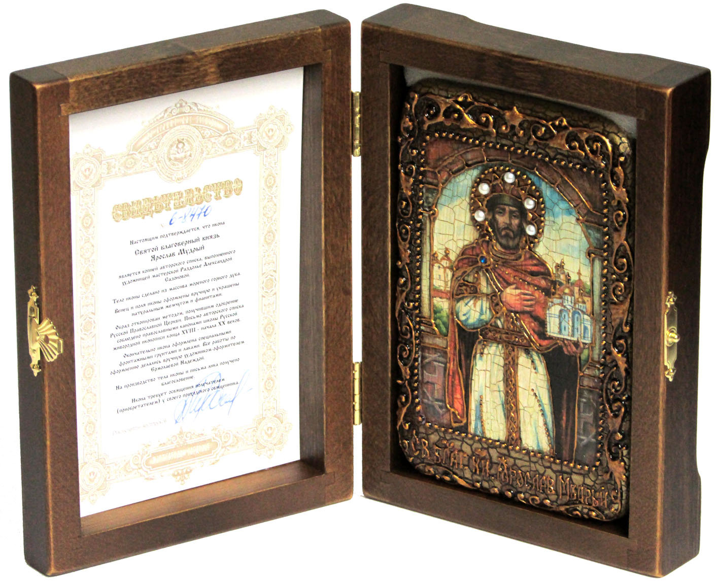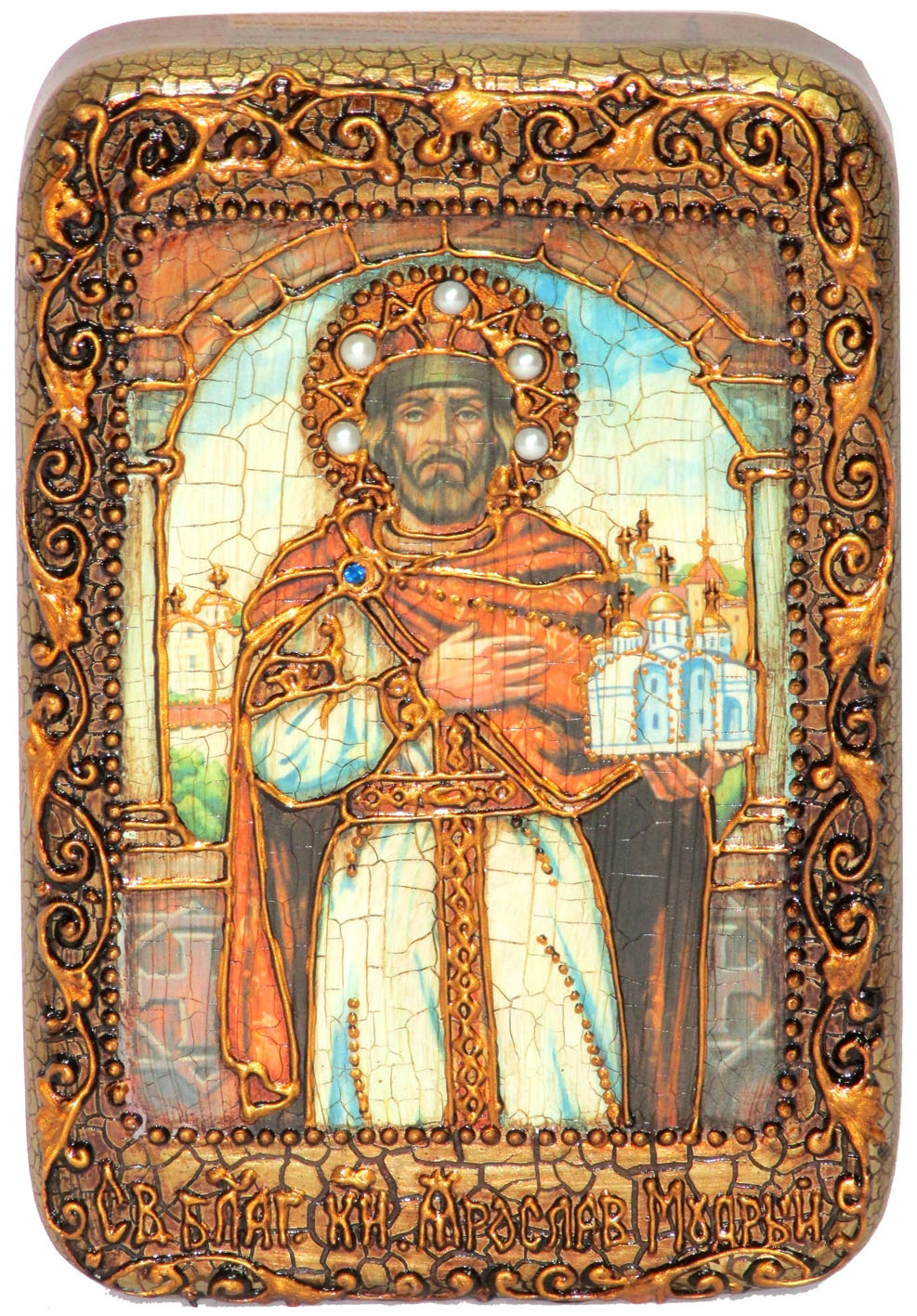 Настольная икона "святой благоверный князь ярослав мудрый" на мо. Ярослав I, в Крещении Георгий (Юрий), Владимирович, Мудрый (ок. 978–989 – 1054), благоверный великий князь Киевский. Память 4 марта (20 февраля) в день кончины. По разным данным родился между 978 и 989 годами, был вторым сыном равноапостольного Владимира от полоцкой княжны Рогнеды. По некоторым сведениям, в детстве он страдал от паралича ног, который прошёл в 988 году, но осталась хромота. Княжение при жизни святого Владимира Еще при своей жизни произведя первый раздел земель между сыновьями, святой Владимир посадил девятилетнего Ярослава в Ростове. В 1011 году, когда Ярослав крестил Волгу, языческие жители урочища Медвежий угол выпустили против него «Святую Медведицу», но князь, вооруженный секирой, одолел зверя. В 1012 году, по смерти старшего сына Вышеслава, святой Владимир перевел Ярослава на княжение в Новгород, миновав старшего, Святополка, который был тогда под гневом отца. Став князем Новгородским, Ярослав хотел порвать зависимость от Киева и стать независимым государем обширной Новгородской области. Он отказался в 1014 году платить отцу ежегодную дань в 2000 гривен, как делали все посадники новгородские. Его желание совпадало и со стремлением новгородцев, которые тяготились налагаемой на них данью. Ярослав был недоволен еще и тем, что отец оказывал предпочтение младшему его брату, Борису. Разгневавшись на Ярослава, Владимир готовился лично идти против него, но вскоре заболел и умер. Ярослав же тем временем нанял дружину варягов для предстоящей борьбы. Междоусобные войны Великокняжеским столом завладел старший в роде Святополк Окаянный, который, желая сделаться единодержавным правителем всей Руси, умертвил через наемных убийц трех братьев – страстотерпцев Бориса и Глеба, а также Святослава. Такая же опасность грозила и Ярославу, но он, предупрежденный сестрой Предславой, сам пошел на Киев. Прежде этого Ярослав был в ссоре с новгородцами за то что часто поддерживал варяжскую дружину в ее кровавых стычках с населением города, но теперь новгородцы легко согласились идти вместе с ним против брата. Собрав тысяч 40 новгородцев и несколько тысяч варяжских наемников, Ярослав двинулся против Святополка, призвавшего себе на помощь печенегов. Ярослав одолел Святополка в яростной сече под Любечем, вступил в Киев, и занял великокняжеский стол в 1016 году, после чего щедро наградил новгородцев и отпустил их домой. Бежавший Святополк возвратился с полками своего тестя, польского короля Болеслава Храброго, а также с дружинами немцев, венгров и печенегов. В 1017 или 1018 году Ярослав был разбит на берегах Буга и бежал в Новгород. Он готов был отплыть в Скандинавию, но новгородцы порубили княжеские ладьи и склонили Ярослава продолжить борьбу. С новым большим войском он разбил наголову Святополка и его союзников-печенегов на реке Альте в 1019 году, на том же месте, где был предательски убит его брат святой Борис. Святополк бежал в Польшу и по дороге умер, а Ярослав в том же году стал великим князем Киевским. Теперь он прочно утвердился в Киеве и, по выражению летописца, «утер пота со своею дружиной». В 1021 году племянник Ярослава, князь Брячислав Изяславич Полоцкий, объявил притязания на часть Новгородских областей. Получив отказ, он напал на Новгород, взял и разграбил его. Услышав о приближении Яросла