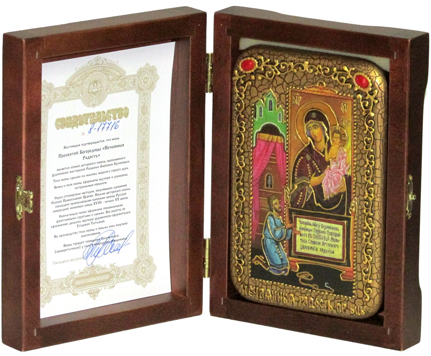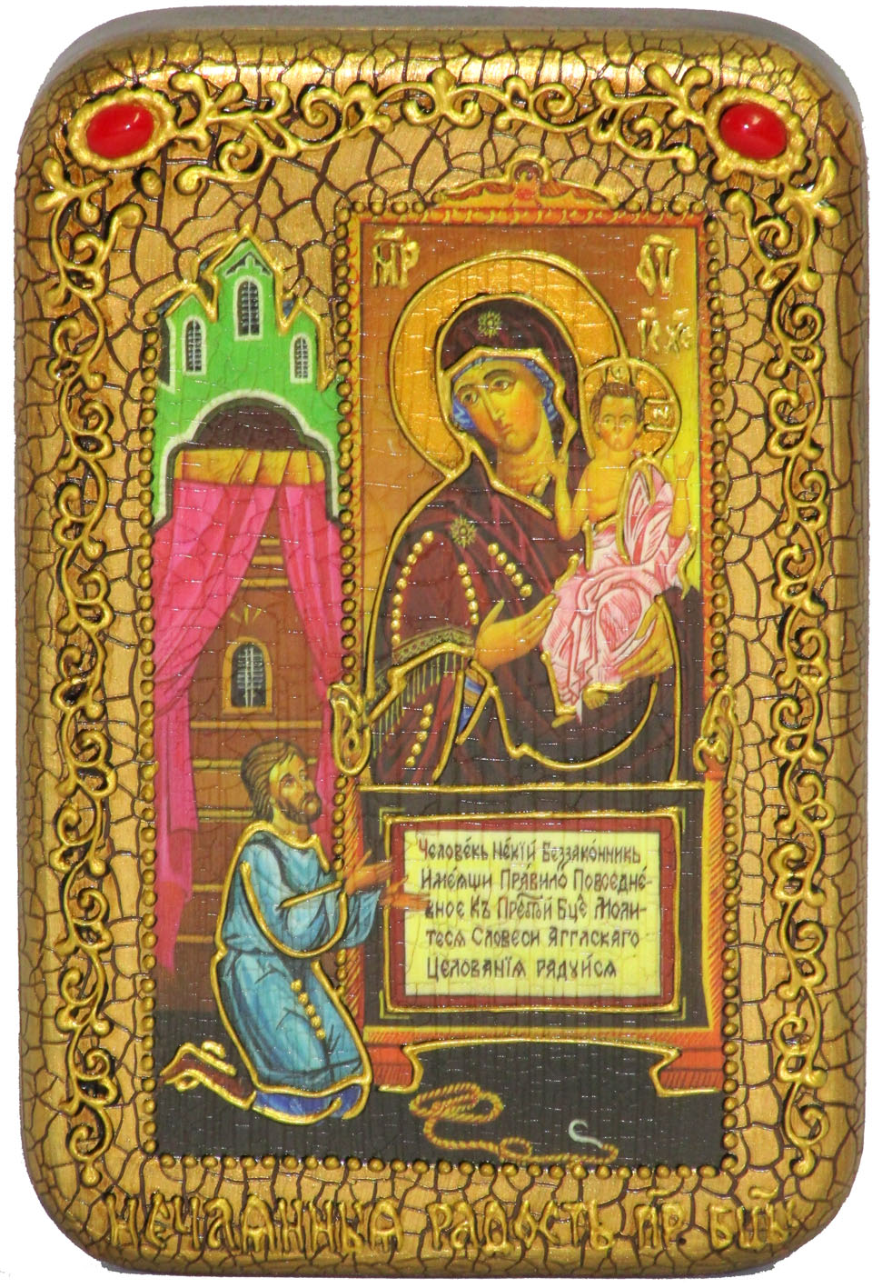 Настольная икона пресвятой богородицы "нечаянная радость" на мор. История этой иконы рассказана святителем Димитрием Ростовским в его творении «Руно орошенное». Один человек, проводивший грешную жизнь, тем не менее был привязан к Богоматери чувством благоговейной любви и ежедневно молился перед Ее иконой, с глубокой верой произнося слова, сказанные некогда архангелом Гавриилом: «Радуйся, Благодатная!..». Как-то раз он собирался идти для греховного дела и перед выходом, обратясь к иконе Богоматери, помолился. Тут внезапно напал на него трепет, и увидел он, что изображение Богоматери как бы задвигалось. У Божественного Младенца открылись язвы на руках, ногах и в боку, и из них хлынула кровь. Пав на землю, преступник закричал: — О, Госпожа, кто это сделал? — Ты и прочие грешники вновь распинаете грехами своими Моего Сына, как иудеи, — отвечала Богоматерь. — Вы называете Меня милосердной. Зачем же вы оскорбляете Меня своими беззаконными делами? — О, Владычица, — отвечал ей грешник, — пусть мои грехи не победят Твоей невыразимой благости. Ты единая надежда всем грешным. Умоли же о мне Сына Твоего и Бога нашего! Дважды повторяла Владычица Свою молитву Младенцу Христу, но Он оставался непреклонен, пока, наконец, на неотступную мольбу Богоматери не ответил: — Я исполняю Твою просьбу. Пусть совершится пожелание Твое. Ради Тебя отпускаются этому человеку его грехи. Пусть же он в знак прощения облобызает Мои язвы. И вот поднялся от земли прощенный грешник, перед которым в таком дивном образе просияло неистощимое милосердие Богоматери, и с невыразимой радостью облобызал язвы Спасителя своего. С тех пор он стал жить чистой, благочестивой жизнью. Это событие и дало верующим повод к написанию иконы Божией Матери «Нечаянная Радость». На этой иконе изображается человек, молящийся на коленях перед ликом Богоматери. Далее под ликом обыкновенно помещаются первые слова повести: «Человек некий беззаконный...». В Москве, в Хамовниках, в церкви Неопалимой Купины, такая икона хранится с 1835 года, когда пожертвована по словесному завещанию прихожанки Александры Куницыной. С 1837 года она стала прославляться чудесами. С понедельника на вторник Светлой седмицы в 1838 году в дом прихожанки этой церкви Анны Тимофеевой пришла унтер-офицерская вдова Анисья Степанова, страдавшая последние четыре месяца глухотой в такой степени, что не могла слышать даже колокольного звона. Лечилась она в больницах, но безуспешно. Она осталась ночевать у Тимофеевой, чтоб на другой день идти к иконе «Нечаянная Радость». Когда на следующее утро женщины попросили отслужить молебен, Анисья вдруг услышала слова пасхального тропаря «Христос воскресе из мертвых», а затем и тропаря Богоматери: «к Богородице прилежно ныне притецем», и после этого ее глухота совершенно прошла. В Кремле, в церкви Благовещения на Житном дворе, есть чтимая икона «Нечаянная Радость». Изображен на ней пожилой человек, молящийся перед иконой Богоматери. Внизу под иконой написана молитва: «О, Богородице, да не преодолеет наша злоба Твоея неизреченныя благости. Ты бо еси всем грешникам надежда; умоли убо о нас Сына Твоего и Бога нашего». Весьма значительное стечение народа бывало ежедневно к другой иконе «Нечаянная Радость», находящейся в Кремле, очень близко к церкви Благовещения, в малом храме равноапостольны