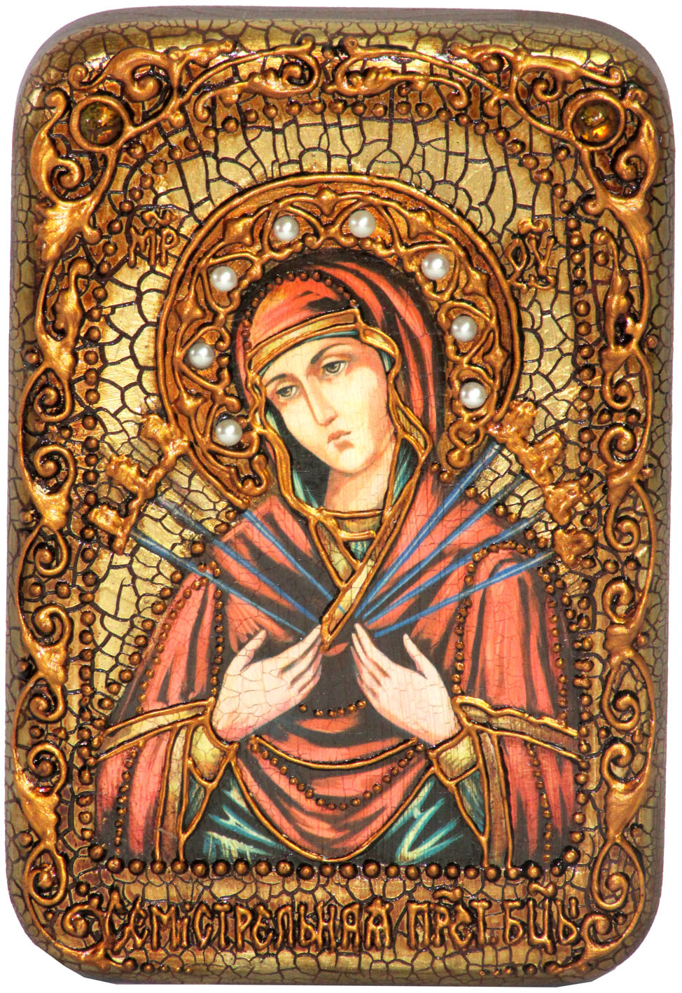 Настольная икона "образ божией матери "семистрельная" на мо. Именуемый так образ Богоматери находится в Тошенской Иоанно-Богословской Семистрельной церкви, на погосте, расположенном недалеко от г. Вологды, на берегу реки Тошни. О первом прославлении «Семистрельной» иконы Богоматери сохранилось следующее предание. Один крестьянин Кадниковского уезда Вологодской губернии в продолжение многих лет страдал болезненной хромотой и расслаблением. Все средства, которые он употреблял для лечения своей болезни, не приносили ему никакой помощи. Не человеческая помощь, а помощь Богоматери вернула этому крестьянину здоровье. Однажды он во сне услышал голос, повелевавший ему отыскать на колокольне Иоанно-Богословской церкви икону Богоматери и помолиться перед ней, и тогда он получит исцеление от своей болезни. Крестьянин два раза приходил в церковь, но его не пускали на колокольню, так как не верили рассказу его о своем сновидении. Он пришел в третий раз. Видя его настойчивость, над ним, наконец, смилосердовались и исполнили его просьбу. Когда крестьянин поднялся на колокольню, он тотчас же нашел икону: она занимала место при повороте лестницы, и по ней звонари ходили, как по простой доске. Найденную святыню очистили от сора и грязи, обмыли и затем отслужили перед ней молебен. Больной крестьянин, усердно молившийся во время молебного пения перед этим образом Богородицы, впоследствии получил исцеление от своей болезни. Прошло немало времени после этого чудесного события, и местные жители как бы стали забывать о чудотворной иконе Божией Матери. Но вот в 1830 году в Вологде неожиданно стала свирепствовать холера. Это бедствие навело страх на жителей и побудило их искать помощи и защиты у Царицы Небесной. Они подняли святые Ее иконы «Семистрельную» и «Семиградскую» и в торжественном крестном ходе обнесли их кругом города. Количество заболеваний заметно стало понижаться, и скоро свирепствовавшая болезнь совершенно прекратилась. «Семистрельная» икона Божией Матери написана на холсте, наклеенном на доску, и свое наименование получила от самого изображения. Богоматерь на ней изображена без Предвечного Младенца, Одна, пронзенная семью стрелами или мечами — четыре с левой стороны и три с правой. Живопись этой иконы носит на себе явные следы давнего происхождения, и знатоки утверждают, что она написана около 500 лет тому назад. Несмотря на такую давность, живопись прекрасно сохраняется и до сих пор. С этой «Семистрельной» иконы Богородицы был сделан один точный список, который также прославился чудесами. Он хранится ныне в городе Вологде, в приходской церкви прп. Димитрия Прилуцкого, что на Наволоке. Наконец, упомянем еще об одной иконе Божией Матери, которая называется «Симеоново проречение», или «Умягчение злых сердец». Ее не следует смешивать с «Семистрельной» иконой Богородицы, хотя на ней Богоматерь также изображается с семью воткнутыми в сердце мечами. Сведения об иконе «Симеоново проречение» помещены под 2 февраля и там же указано, чем она отличается по изображению от «Семистрельной» иконы Божией Матери. Дата празднования: Празднование этому образу совершается 26 августа. Икона выполнена на натуральной деревянной доске, изготовленной из массива мореного дуба. Образ откопирован с авторского списка методом. получившим одобрение русс
