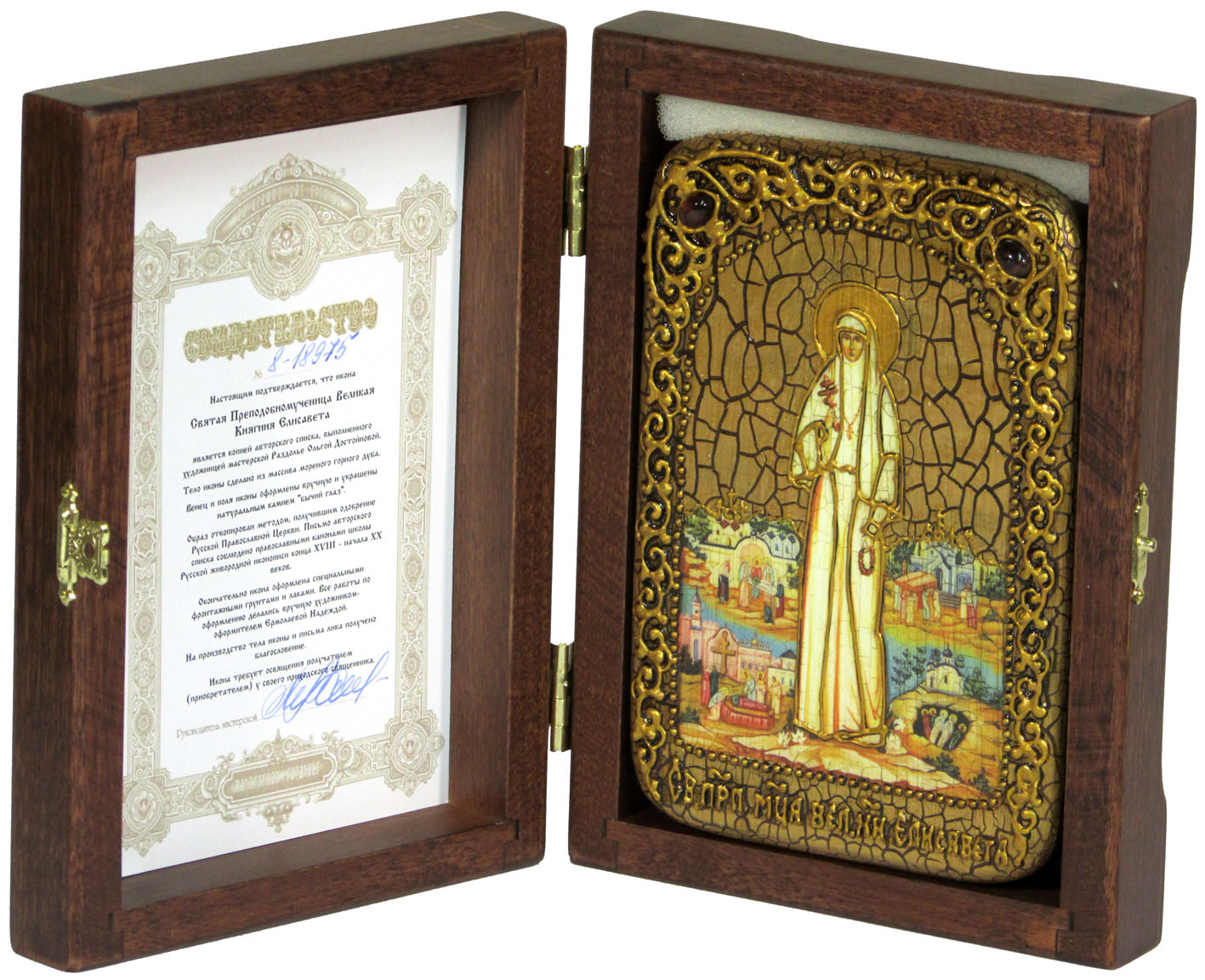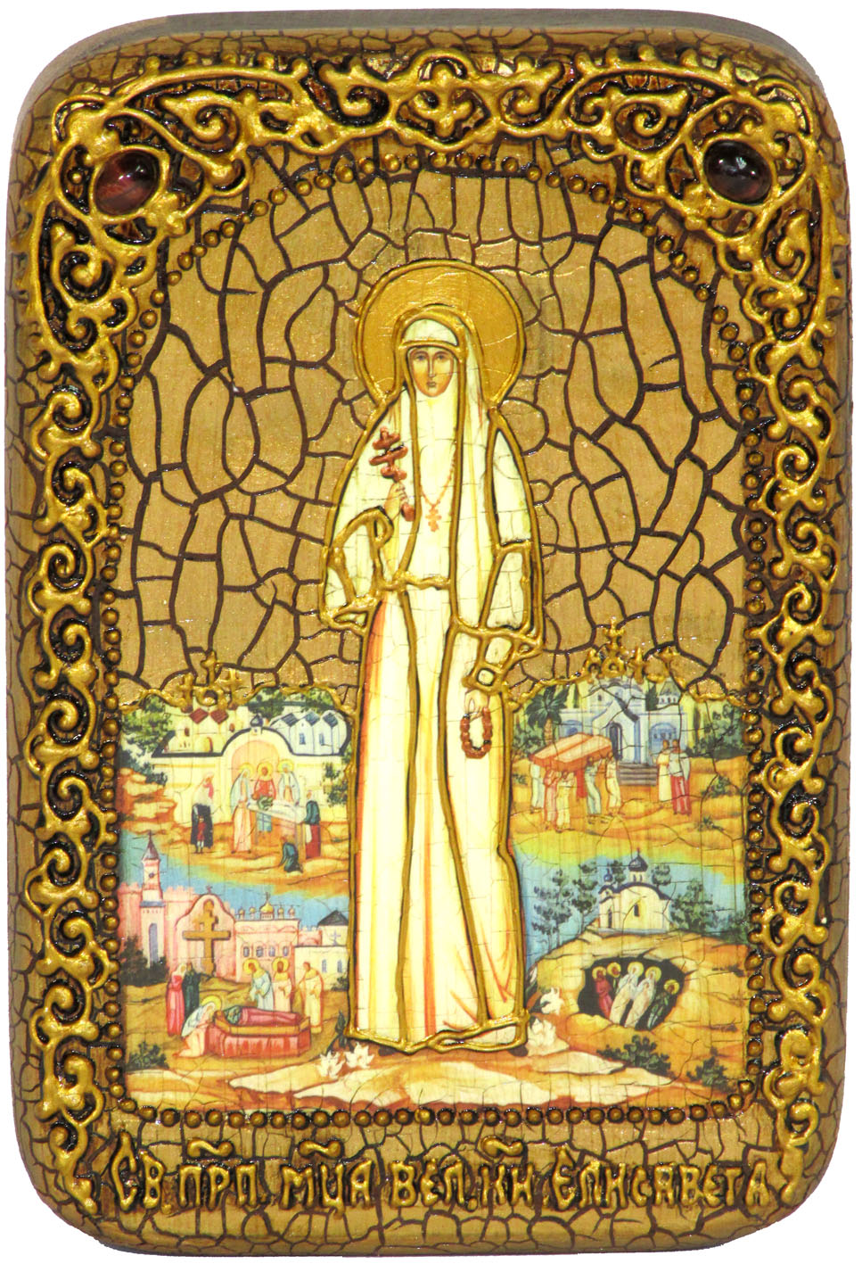 Настольная икона "святая преподобномученица великая княгиня елисавета. Преподобномученица великая княгиня Елисавета родилась 20 октября 1864 года в протестантской семье великого герцога Гессен-Дармштадтского Людвига IV и принцессы Алисы, дочери английской королевы Виктории. В 1884 году она вышла замуж за великого князя Сергея Александровича, брата императора Российского Александра III. Видя глубокую веру своего супруга, великая княгиня всем сердцем искала ответ на вопрос – какая же религия истинна? Она горячо молилась и просила Господа открыть ей Свою волю. 13 апреля 1891 года, в Лазареву субботу, над Елисаветой Феодоровной был совершен чин принятия в Православную Церковь. В том же году великий князь Сергей Александрович был назначен генерал-губернатором Москвы. Посещая храмы, больницы, детские приюты, дома для престарелых и тюрьмы, великая княгиня видела много страданий. И везде она старалась сделать что-либо для их облегчения. После начала в 1904 году русско-японской войны Елисавета Феодоровна во многом помогала фронту, русским воинам. Трудилась она до полного изнеможения. 5 февраля 1905 года произошло страшное событие, изменившее всю жизнь Елисаветы Феодоровны. От взрыва бомбы революционера-террориста погиб великий князь Сергей Александрович. Бросившаяся к месту взрыва Елисавета Феодоровна увидела картину, по своему ужасу превосходившую человеческое воображение. Молча, без крика и слез, стоя на коленях в снегу, она начала собирать и класть на носилки части тела горячо любимого и живого еще несколько минут назад мужа. В час тяжелого испытания Елисавета Феодоровна просила помощи и утешения у Бога. На следующий день она причастилась Святых Тайн в храме Чудова монастыря, где стоял гроб супруга. На третий день после гибели мужа Елисавета Феодоровна поехала в тюрьму к убийце. Она не испытывала к нему ненависти. Великая княгиня хотела, чтобы он раскаялся в своем ужасном преступлении и молил Господа о прощении. Она даже подала государю прошение о помиловании убийцы. Елисавета Феодоровна решила посвятить свою жизнь Господу через служение людям и создать в Москве обитель труда, милосердия и молитвы. Она купила на улице Большая Ордынка участок земли с четырьмя домами и обширным садом. В обители, которая была названа Марфо-Мариинской в честь святых сестер Марфы и Марии, были созданы два храма – Марфо-Мариинский и Покровский, больница, считавшаяся впоследствии лучшей в Москве, и аптека, в которой лекарства отпускались бедным бесплатно, детский приют и школа. Вне стен обители был устроен дом-больница для женщин, больных туберкулезом. 10 февраля 1909 года обитель начала свою деятельность. 9 апреля 1910 года за всенощным бдением епископ Дмитровский Трифон (Туркестанов; † 1934) по чину, разработанному Святейшим Синодом, посвятил насельниц в звание крестовых сестер любви и милосердия. Сестры дали обет, по примеру инокинь, проводить девственную жизнь в труде и молитве. На следующий день за Божественной литургией святитель Владимир, митрополит Московский и Коломенский, возложил на сестер восьмиконечные кипарисовые кресты, а Елисавету Феодоровну возвел в сан настоятельницы обители. Великая княгиня сказала в тот день: «Я оставляю блестящий мир ... но вместе со всеми вами я восхожу в более великий мир – в мир бедных и страдающих». В Марфо-Мариинской оби