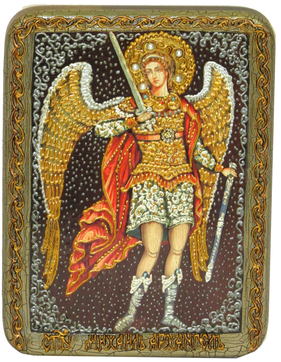 Подарочная икона архангел михаил на мореном дубе. Образ Архангела Михаила Архангел Михаил считается величайшим и наиболее почитаемым ангелом в иудейской, христианской и исламской традициях и писаниях. По верованиям мусульман, он - ангел природы, наделяющий человека как пищей, так и знанием. В еврейской мистической традиции Архангел Михаил отождествляется с ангелом, с которым боролся Иаков. Он же поразил армии Сеннахирима, он спас трех еврейских мальчиков, брошенных в раскаленную огнем печь. Архангел Михаил был также тем ангелом, который явился Иисусу Навину, когда тот готовился вести Израильтян в битву при Иерихоне. Об Архангеле Михаиле говорит и апостол Иоанн в Книге Откровение, рассказывая, что именно Михаил низверг дьявола и его ангелов с Небес на землю.315 Отсюда мы знаем, что падшие ангелы приняли воплощение, и что враги Христа живут в мире формы. Именно Архангел Михаил и легионы голубой молнии, служащие с ним, защищают детей Бога от врага - Антихриста. В православии архангел Михаил выступает главой святого воинства ангелов, стоящих на страже Божьего закона, этот образ присутствует уже начиная с апостольских времён . Следуя этой традиции, в Великих четьях-минеях митрополит Макарий пишет: «Бог поставил как некое всесильное оружие и сохранение Михаила архистратига против силы дьявола». В этом образе Михаил почитается как покровитель и соратник «воинствующей Церкви», то есть всех верных Богу, выступающих против сил зла. Михаил, исходя из приписываемой ему роли на Страшном суде, стал почитаться как защитник душ умерших. Ему были вверены Богом души Авраама и Богородицы при перенесении их на небо. К Архангелу Михаилу также обращаются с молитвами об исцелении. Это связано с указанным выше почитанием Михаила Архангела как победителя злых духов, которые в христианстве считались источником болезней. Икона написана на натуральной деревянной доске, изготовленной из массива мореного дуба. Для оформления образа использованы специальные фронтажные грунты и выравнивающие лаки. Венец и поля иконы украшены вручную в стилистике русского орнамента. К каждой иконе прилагается номерное свидетельство с полной информацией о ней. Размер иконы: 15х20 см - полу-аналойный. Артикул: RTI-246.m Икона - лучший подарок, потому что, даря икону, мы выражаем человеку высшую степень христианской любви – пожелание спасения души.