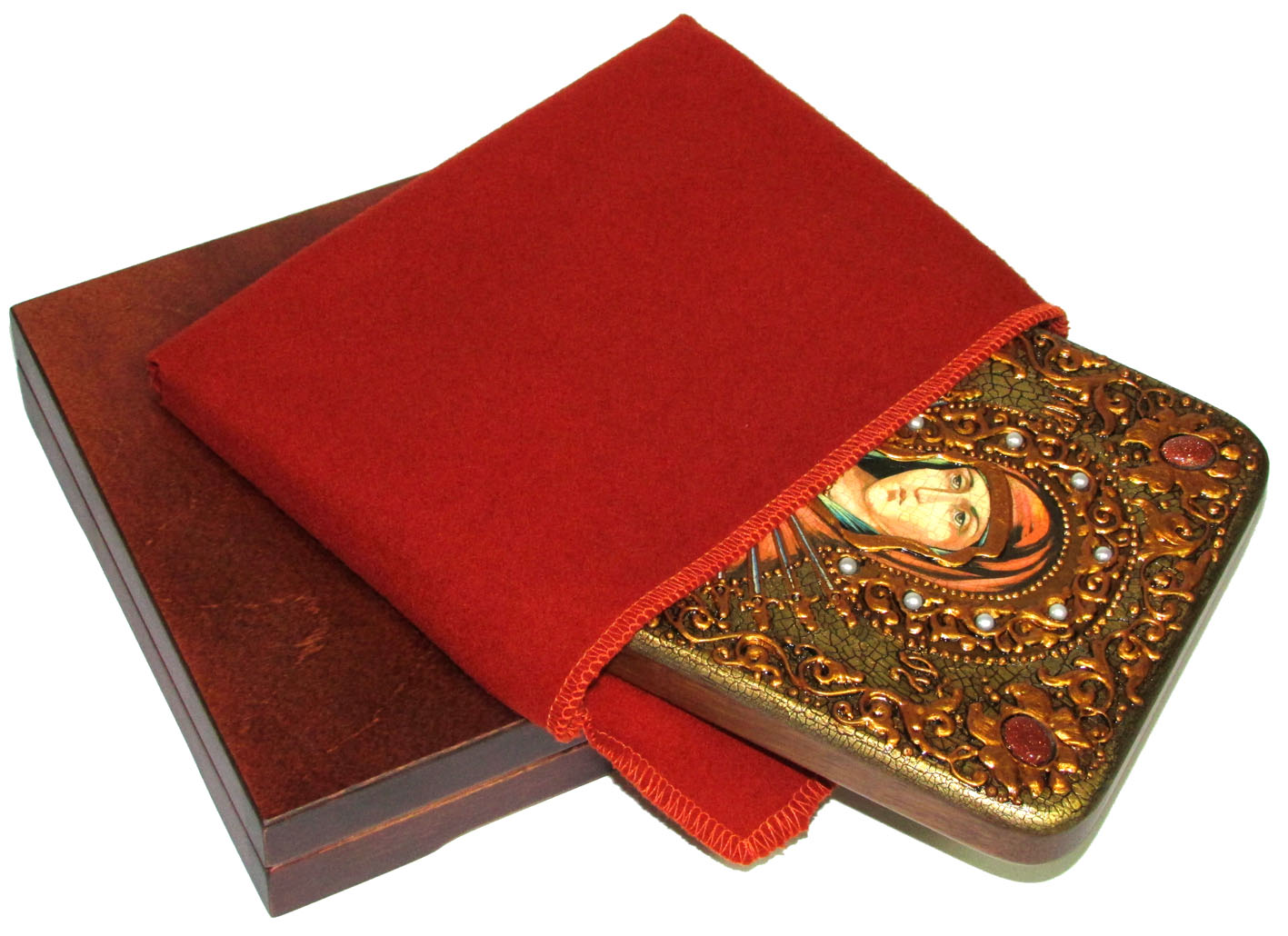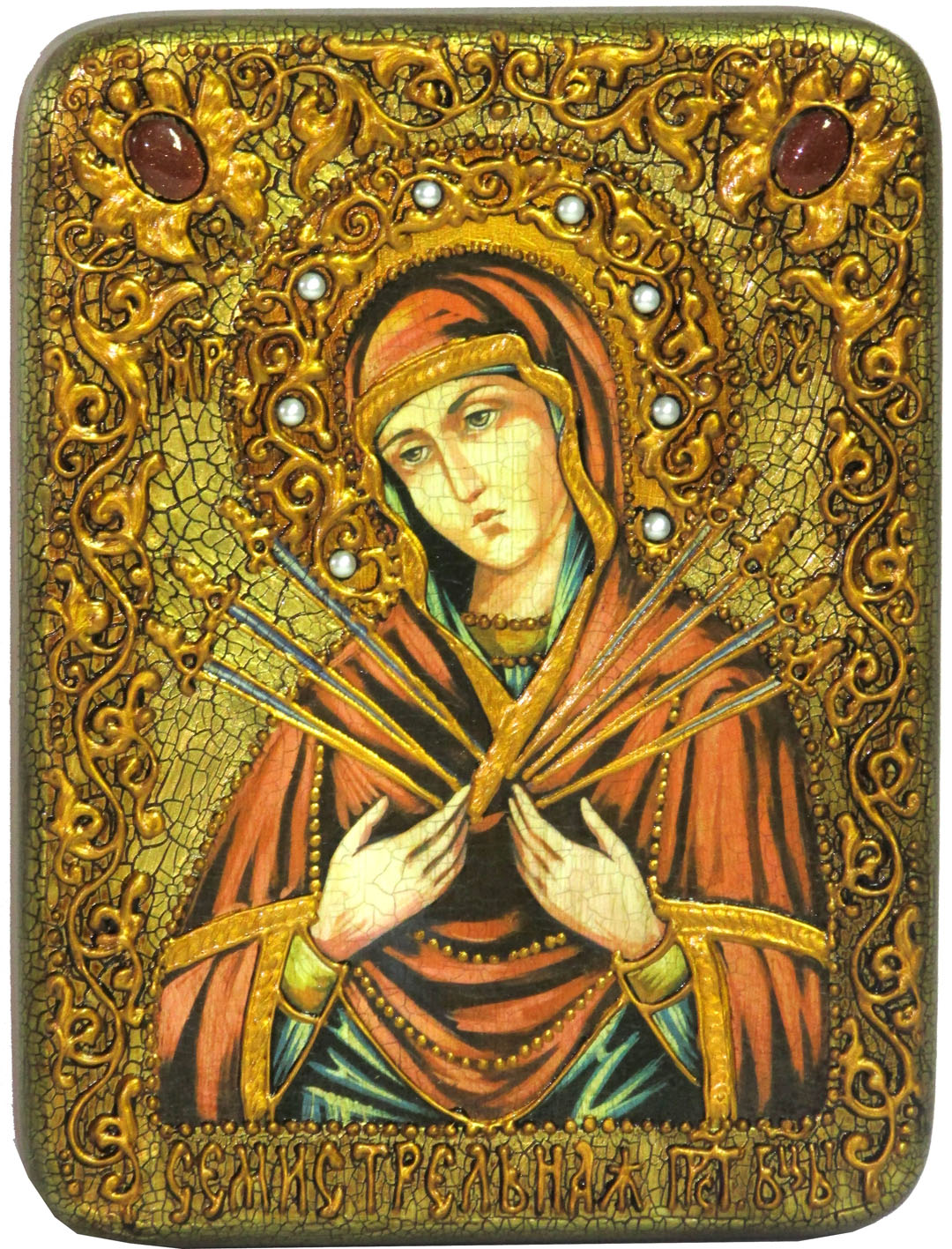 Подарочная икона "образ божией матери "семистрельная" на мо. Именуемый так образ Богоматери находится в Тошенской Иоанно-Богословской Семистрельной церкви, на погосте, расположенном недалеко от г. Вологды, на берегу реки Тошни. О первом прославлении «Семистрельной» иконы Богоматери сохранилось следующее предание. Один крестьянин Кадниковского уезда Вологодской губернии в продолжение многих лет страдал болезненной хромотой и расслаблением. Все средства, которые он употреблял для лечения своей болезни, не приносили ему никакой помощи. Не человеческая помощь, а помощь Богоматери вернула этому крестьянину здоровье. Однажды он во сне услышал голос, повелевавший ему отыскать на колокольне Иоанно-Богословской церкви икону Богоматери и помолиться перед ней, и тогда он получит исцеление от своей болезни. Крестьянин два раза приходил в церковь, но его не пускали на колокольню, так как не верили рассказу его о своем сновидении. Он пришел в третий раз. Видя его настойчивость, над ним, наконец, смилосердовались и исполнили его просьбу. Когда крестьянин поднялся на колокольню, он тотчас же нашел икону: она занимала место при повороте лестницы, и по ней звонари ходили, как по простой доске. Найденную святыню очистили от сора и грязи, обмыли и затем отслужили перед ней молебен. Больной крестьянин, усердно молившийся во время молебного пения перед этим образом Богородицы, впоследствии получил исцеление от своей болезни. Прошло немало времени после этого чудесного события, и местные жители как бы стали забывать о чудотворной иконе Божией Матери. Но вот в 1830 году в Вологде неожиданно стала свирепствовать холера. Это бедствие навело страх на жителей и побудило их искать помощи и защиты у Царицы Небесной. Они подняли святые Ее иконы «Семистрельную» и «Семиградскую» и в торжественном крестном ходе обнесли их кругом города. Количество заболеваний заметно стало понижаться, и скоро свирепствовавшая болезнь совершенно прекратилась. «Семистрельная» икона Божией Матери написана на холсте, наклеенном на доску, и свое наименование получила от самого изображения. Богоматерь на ней изображена без Предвечного Младенца, Одна, пронзенная семью стрелами или мечами — четыре с левой стороны и три с правой. Живопись этой иконы носит на себе явные следы давнего происхождения, и знатоки утверждают, что она написана около 500 лет тому назад. Несмотря на такую давность, живопись прекрасно сохраняется и до сих пор. С этой «Семистрельной» иконы Богородицы был сделан один точный список, который также прославился чудесами. Он хранится ныне в городе Вологде, в приходской церкви прп. Димитрия Прилуцкого, что на Наволоке. Наконец, упомянем еще об одной иконе Божией Матери, которая называется «Симеоново проречение», или «Умягчение злых сердец». Ее не следует смешивать с «Семистрельной» иконой Богородицы, хотя на ней Богоматерь также изображается с семью воткнутыми в сердце мечами. Сведения об иконе «Симеоново проречение» помещены под 2 февраля и там же указано, чем она отличается по изображению от «Семистрельной» иконы Божией Матери. Дата празднования: Празднование этому образу совершается 26 августа. Икона выполнена на натуральной деревянной доске, изготовленной из массива мореного дуба. Образ откопирован с авторского списка методом. получившим одобрение русс